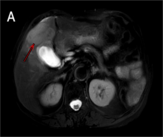影像学检查在肝肉瘤样癌(hepatic sarcomatoid carcinoma, HSC)的诊断中具有重要价值,常用手段包括CT、MRI及超声。其影像表现受肿瘤大小、生长方式及肉瘤样成分比例等因素影响,缺乏特异性。超声检查中,较小肿瘤多呈低回声,较大者可表现为高回声[6]。CT平扫常显示为边界不清的囊实性低密度灶,增强扫描动脉期多见明显不均匀环形强化,门静脉期及延迟期呈快速廓清,整体强化模式与肝细胞癌相似。值得注意的是,HSC确诊时肿瘤体积通常较大,易侵犯邻近结构。尽管其胆管扩张发生率显著低于肝内胆管细胞癌(intrahepatic cholangiocarcinoma, ICC) [7],这也是本例HSC术前被误诊为ICC的重要原因,但大体积病灶压迫或浸润胆管时仍可引起继发性胆道扩张,导致术前误诊为ICC,本例即因病灶累及胆囊床并伴局部胆管扩张而被初步判断为ICC。MRI表现具有一定特征性:T1加权像多呈低或等信号,T2加权像呈高或稍高信号,DWI序列常呈明显高信号[4]。增强扫描多表现为动脉期周边或不均匀强化,部分病例呈现进行性延迟强化,约1/3病例可见持续性高强化[5];这一现象可能与肿瘤间质纤维化或血供分布相关。另有研究显示,24例HSC患者中多数以“周边强化”为主[4],而另一项17例研究则报告以渐进性强化为特征[5],差异可能源于样本量不同或肿瘤内部肉瘤样成分比例及微血管结构异质性所致。综上所述,HSC的影像学表现多样且非特异,易与其他原发性肝癌混淆。结合临床背景,细致分析其强化模式、病灶形态及伴随征象,有助于提高术前识别能力,但仍需依赖术后病理确诊。