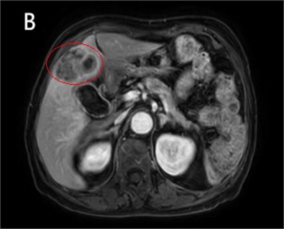 患者女性,80岁,因“右上腹隐痛20天”于2023年11月就诊于当地医院。腹部CT提示肝内占位,遂转至我院进一步诊治。患者否认恶心、呕吐、反酸、黄疸、发热、呕血、黑便等症状。既往有高血压、冠心病及脑梗死病史多年,规律服用降压药及抗血小板药物,病情稳定;无病毒性肝炎、肝硬化或长期饮酒史,家族中无肿瘤遗传倾向。入院查体:生命体征平稳,全身皮肤黏膜无黄染,浅表淋巴结未触及肿大。腹部平坦,未见静脉曲张,右上腹轻度压痛,无反跳痛及肌紧张,肝脾肋下未触及,移动性浊音阴性,肠鸣音正常。实验室检查:肝功能基本正常,直接胆红素9.00 μmol/L,白蛋白39.4 g/L,ALT、AST、ALP、GGT均在参考范围内;凝血功能正常。肿瘤标志物检测结果显示:甲胎蛋白(AFP) 2.0 ng/ml (正常值 < 7 ng/ml),癌胚抗原(CEA) 1.35 ng/ml (正常),糖类抗原CA19~98.75 U/ml (正常);乙型肝炎表面抗原(HBsAg)阴性,丙型肝炎抗体阴性。上腹部增强MRI联合MRCP显示:右肝V段见一大小约4.5 cm × 3.8 cm不规则软组织信号影,T1WI呈低信号,T2WI呈稍高信号,DWI呈明显高信号(图1)。增强扫描动脉期呈轻度不均匀强化,门静脉期及延迟期持续强化,邻近胆囊床受累,局部胆管扩张,胆囊稍增大。未见远处转移征象。初步考虑为肝内胆管细胞癌累及胆囊。经多学科团队(MDT)评估,患者心肺功能可耐受手术,无明确手术禁忌证。行剖腹探查术。术中见肝脏表面光滑,无肝硬化改变;胆囊底部与肝脏结合部有一实性肿块,直径约5 cm,质地坚硬,突出于肝表面,初步判断可能来源于胆囊或肝实质。遂行胆囊切除 + 肝S5段楔形切除术,并清扫肝十二指肠韧带周围淋巴结。术后病理检查示:肿瘤呈结节状,切面灰白、质脆(图2),镜下见大量异型明显的梭形细胞弥漫增生,核分裂象多见,伴有广泛凝固性坏死(图3)。部分区域可见残留腺样结构,提示上皮来源背景。脉管内可见癌栓形成,并见肿瘤侵犯周围神经束。肝切缘及胆总管残端未见肿瘤累及。“胆囊颈”(1/1)及“肝十二指肠韧带旁”(1/6)淋巴结见癌转移。免疫组化结果如下:细胞角蛋白(CK) (+)、CK19 (+)、CD10 (少量+);Hepatocyte (-)、Arginase-1 (-),排除典型肝细胞癌;CD31 (+)、CD34 (-)、ERG (-),排除血管源性肿瘤;Desmin (-),排除平滑肌肉瘤;Ki-67阳性指数约70%,提示极高增殖活性。结合组织形态学与免疫表型,最终诊断为:原发性肝肉瘤样癌(HSC),结节型,低分化,伴脉管癌栓、神经侵犯及区域淋巴结转移(pN1)。