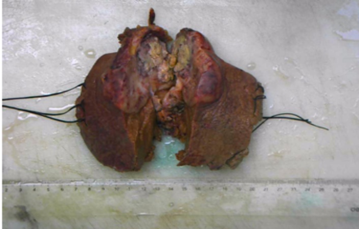 注:肝4b、5段SHC,肿瘤呈结节状,切面灰白、质韧。