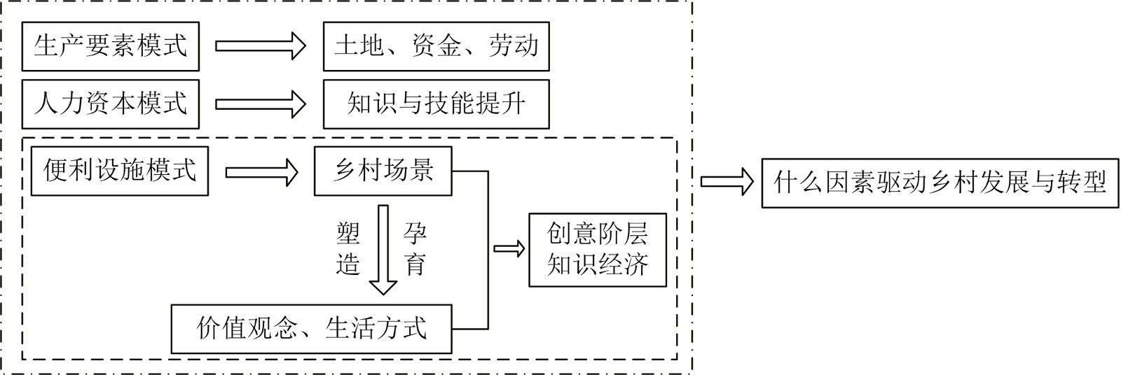 一是生产要素模式。亚当·斯密提倡“生产要素”理论即“劳动、土地、资本”三要素说,着重强调生产要素在推动乡村进步中的根本性作用[5]。二是人力资本模式。马克思劳动价值论揭示的生产要素流动性配置机制中,劳动力资源的动态转移被确认为影响产业空间分异与区域发展梯度差的关键性驱动因素,凸显了高质量人力资本对乡村社会进步与经济增长的作用[6]。罗建章[7]、曹聪敏[8]等学者指出,在乡村发展的过程中,乡村精英有着多元化的角色,对村庄发展有深远的影响。韩国的新村运动[9],也凸显了乡村精英在联结村庄内外资源、促进村庄进步中的桥梁与纽带作用。三是便利设施模式。该模式从乡村便利设施的角度出发,分析了人口流动与经济增长的内在联系[10]。在未来竞争中,乡村的优势将主要表现在其吸引高端人力资本的能力上,其中,创意阶层作为此类人力资本的重要构成,其集聚不仅受经济动因的驱动,还深受乡村便捷设施、文化活动、个性化表达空间及契合该群体偏好的生活模式等多种要素的吸引。