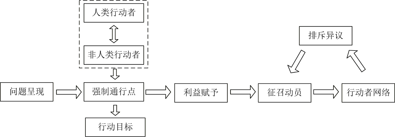 该理论建构包含三个基本维度:一是异质性行动者,它突破传统研究范式将非人类行动者纳入分析框架[21];二是转译机制的作用机理,揭示核心行动者如何实现利益协调;三是网络动态演化规律,强调协同关系的持续调适过程。其中转译机制作为理论核心,包含四个递进环节:问题界定环节需确立各方认同的基础框架;利益赋予过程通过价值重构形成行动激励;动员征召阶段完成主体间的角色绑定;排除异议机制则保障协作关系的稳定性[22]。这种机制设计有效解决了多元主体间的目标分歧,确保各参与方在共同框架下实现功能耦合(图3)。
