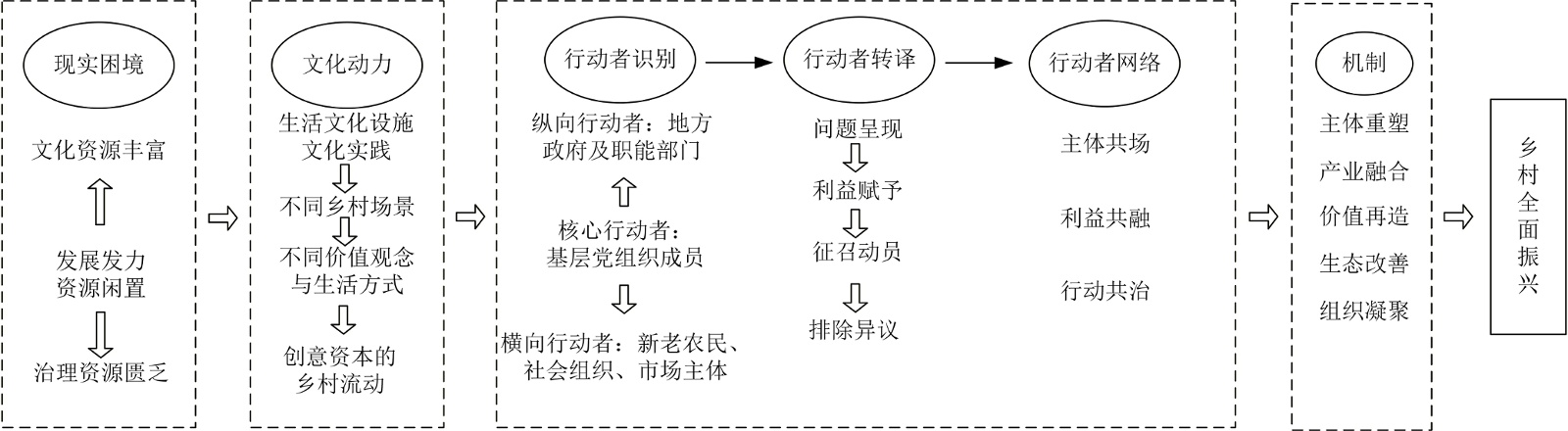 乡村文创产业的可持续发展需要依托创意资本的良性运作。文化要素作为关键驱动力,能够有效吸引创意人才、艺术从业者、社会组织及市场主体等多元力量返乡参与乡村建设。在此过程中,地方政府、基层组织成员、新老村民群体、社会组织等共同构成文创产业发展的实践主体,通过协同推进形成乡村振兴合力。基于行动者网络理论的分析框架,能够系统阐释多元主体的功能定位与互动关系,揭示其网络构建的内在机理,进而解构文创产业赋能乡村振兴的具体实现路径。本研究通过文化动力理论与行动者网络理论的双重视角,构建起契合乡村振兴战略需求的综合性分析框架(图4)。