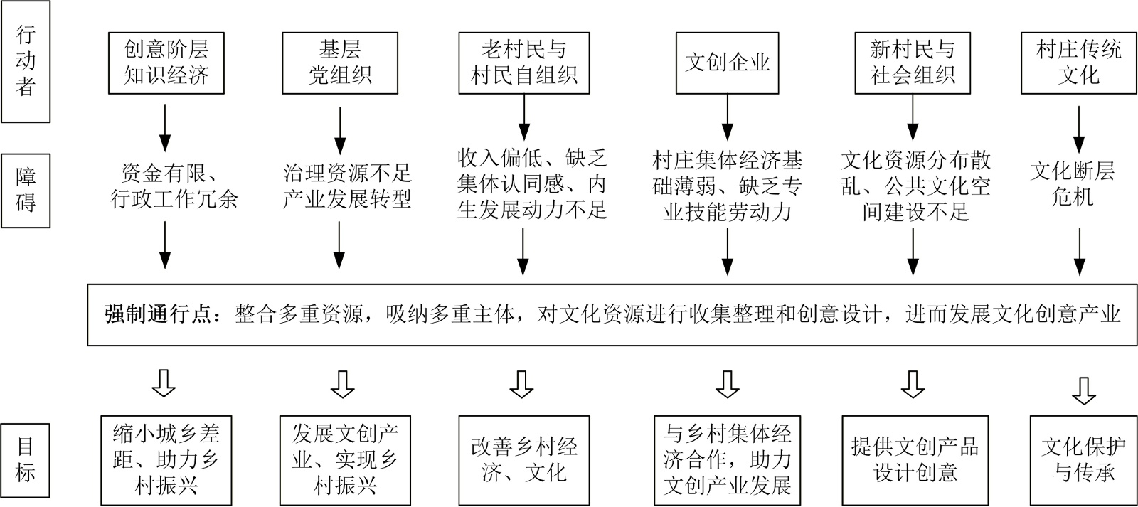 首先,乡土文化资源具有多维价值属性,涵盖农耕文化、民俗传统及乡贤文化等多元类型,既包含文物古迹、传统村落等物质文化遗产,也涉及戏剧曲艺、舞蹈杂技等非物质文化遗产,它们都是乡村文化供给的优秀载体[23]。但在城镇化快速推进背景下,乡村人口结构性流失与代际传承断层导致文化传承主体弱化,形成文化资源存量丰富与治理能力不足并存的现实矛盾,造成资源闲置与内生动力匮乏的治理困境。其次,在乡村振兴战略实施框架下,文化资源作为特定场域的基础性支撑要素,其在推进国家治理体系现代化转型过程中展现出独特的内生动力机制。新农村建设与脱贫攻坚工程显著改善乡村基础设施条件,交通网络优化与数字基础设施的全面覆盖有效缩小了城乡硬件差距,要素流动速率持续提升。乡村特有的生活场景与文化实践构建起差异化价值空间,其承载的非标准化生活方式与文化价值观念,正成为吸引城市创意资本下乡的关键引力场。再次,多元主体参与形成的协同系统存在复杂互动关系。除地方政府、基层党委、新老村民等生命体行动者外,文化资本、物理空间等非人类要素同样构成网络节点。基于文化产业化逻辑的资源开发过程,涉及纵向科层体制中的治理资源调配与横向市场、社会主体的协同合作,需通过纵横交错的网络框架实现主体关系的结构化呈现[24]。行动者转译机制具体展现核心行动者如何通过强制通行点的设定,引导多元主体形成利益共识,并在利益赋予、征召动员等环节化解认知分歧,最终构建起目标协同的行动网络。最后,从行动者网络建构视角审视,乡村振兴本质上是多元主体利益耦合的动态演进过程。文创产业通过主体角色重构、产业形态创新、文化价值转化及组织效能提升等机制,推动多元主体形成治理合力。在利益目标校准与成效评估的循环过程中,各主体通过资源整合与功能互补实现共同利益增值,促进文化资源活化利用与乡村产业系统升级,最终达成产业、人才、文化、生态、组织等多维度的协同发展格局。