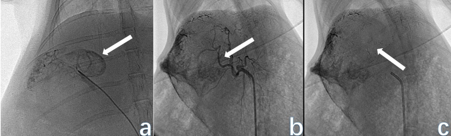 (a) 为TAE术中肿瘤供血肝动脉分支较多且走行紊乱,血管推移呈“抱球征”;(b) 为TAE术后复查造影,显示肿瘤供血动脉血流中断,血管闭塞;(c) 为TAE术后平片,见肿瘤区有碘油沉积。