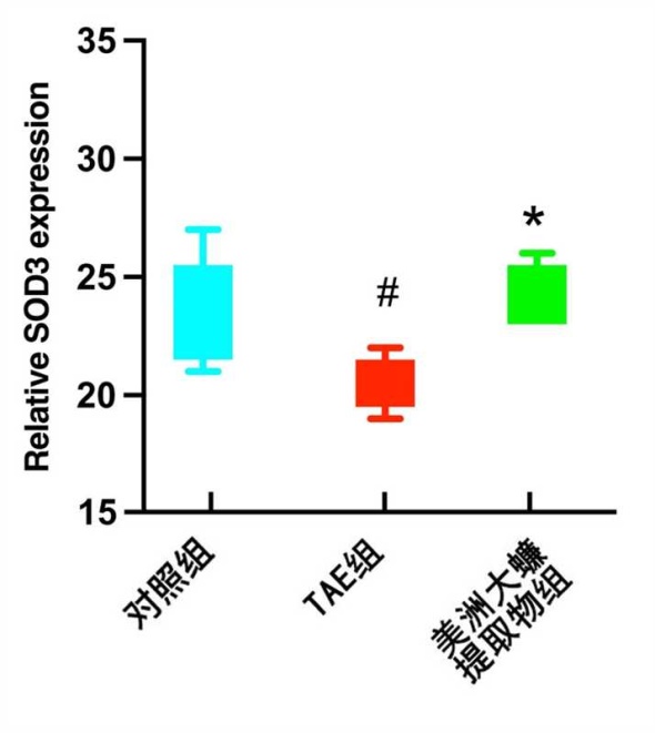 κB、SOD1、SOD2、SOD3 mRNA的表达量。结果:前期人群研究中,术前、术后3天、7天、30天的ALT水平分别为(83.89 ± 21.24)、(63.59 ± 21.35)、(57.89 ± 24.24) U/L,AST水平分别为(117.37 ± 27.40)、(86.37 ± 27.53)、(87.52 ± 30.40) U/L,TAE术治疗后3天、7天、30天复查肝功能与术前相比,ALT、AST升高,差异显著(P < 0.05),术后7天肝功能各指标较术后3天显著改善,一个月后复查肝功能与术前比较,各指标均无显著性差异(P > 0.05);对照组、TAE组、美洲大蠊提取物组PPAR-