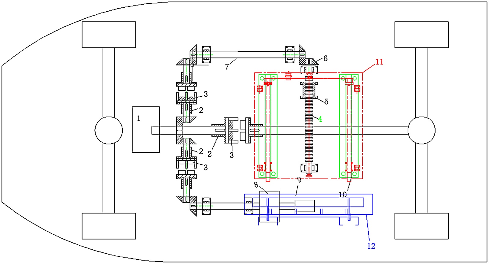 1:发动机;2:连接法兰;3:电磁离合器;4:丝杠;5:螺母座;6:锥齿轮;7:连接轴;8:减速箱;9:滚桶;10:T型钢轨道;11:底部叉伸出系统;12:侧面提升系统。