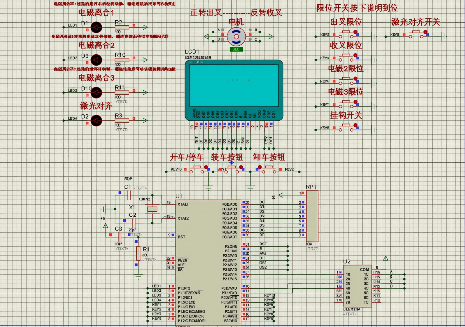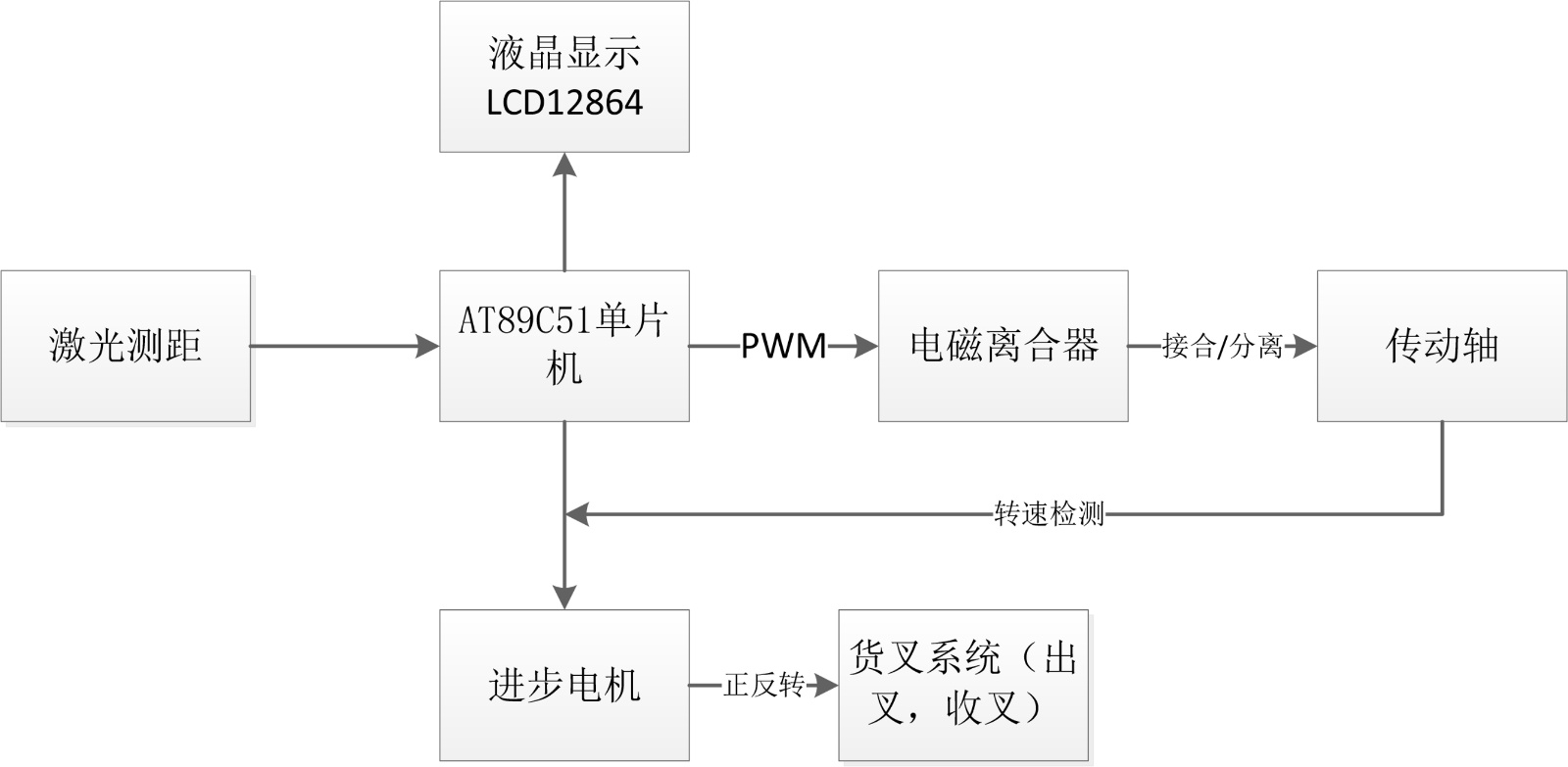 1) 本次设计控制系统主要由单片机来控制传动系统和货叉系统,其中传动系统的动力由发动机来提供,利用单片机控制驱动轴与传动轴之间的电磁离合器线圈电路,来控制驱动轴与传动轴之间的连接、分离和转向,从而实现侧向升降和横向平移功能,而货叉系统的动力由电机来提供,电机选用步进电机正转出叉、反转收叉[7]。