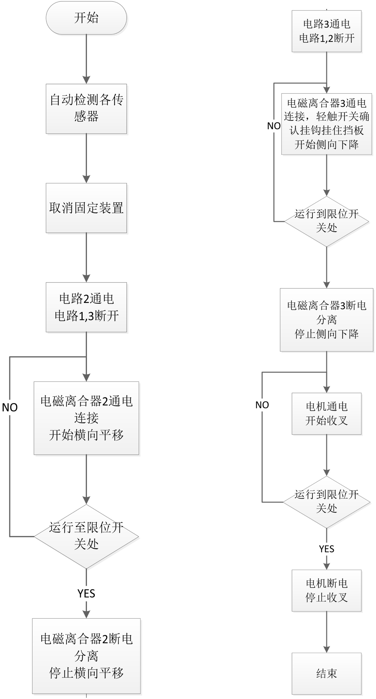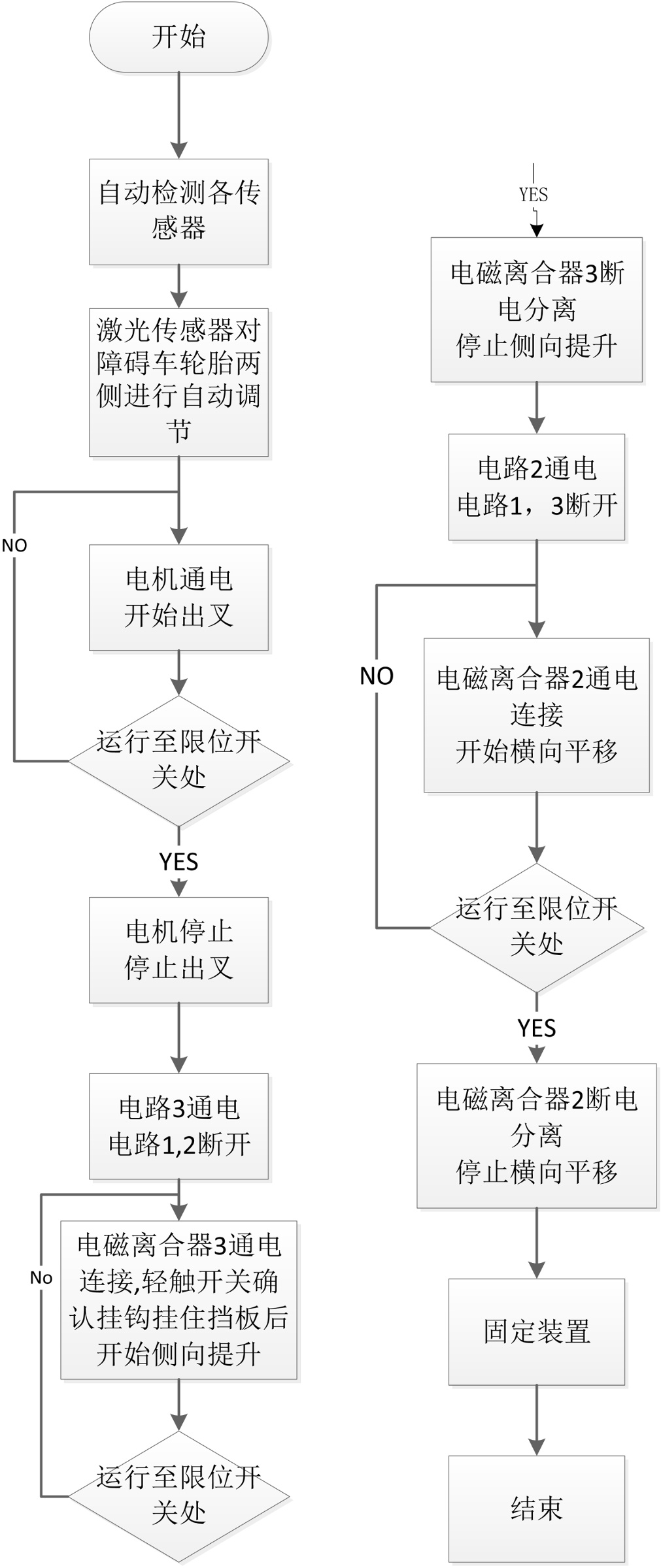 当清障车开到指定位置后停下,检测各传感器工作是否正常,待各传感器工作正常后,固定装置取消,电路2通电,电路1、3断开,电磁离合器2线圈通电连接,丝杠开始工作,开始横向平移,当平移到电磁2限位开关S4处,限位开关S4断开,电磁离合器2断电分离,平移停止;然后电路3通电,电路1、2断开,电磁离合器3线圈通电开始连接,滚筒开始工作,挂钩挂住挡板,此时挂钩轻触开关S2确认挂钩成功挂住挡板后开始侧面下降,当下降到电磁3限位开关S3,限位开关S3断开电磁离合器3断电分离,停止下降;此时电机通电开始运转提供动力给货叉系统,开始收叉,当叉子收回到收叉限位开关S5,限位开关S5断开电机断电停止,停止收叉,至此工作结束[14]。