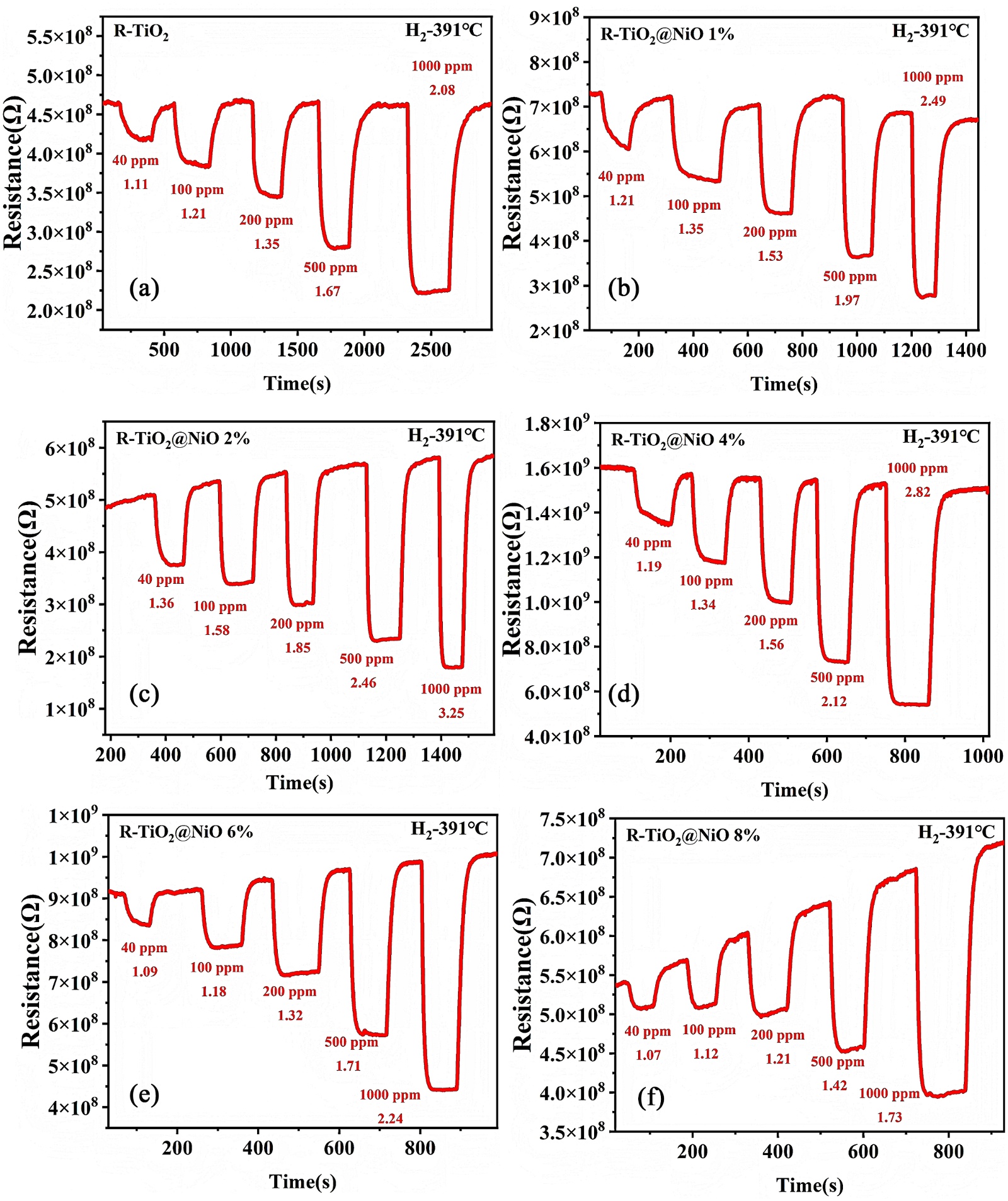 图1. 不同浓度NiO修饰金红石相TiO2的动态响应曲线。(a) R-TiO2;(b) R-TiO2@NiO 1%;(c) R-TiO2@NiO 2%;(d) R-TiO2@NiO 4%;(e) R-TiO2@NiO 6%;(f) R-TiO2@NiO 8%