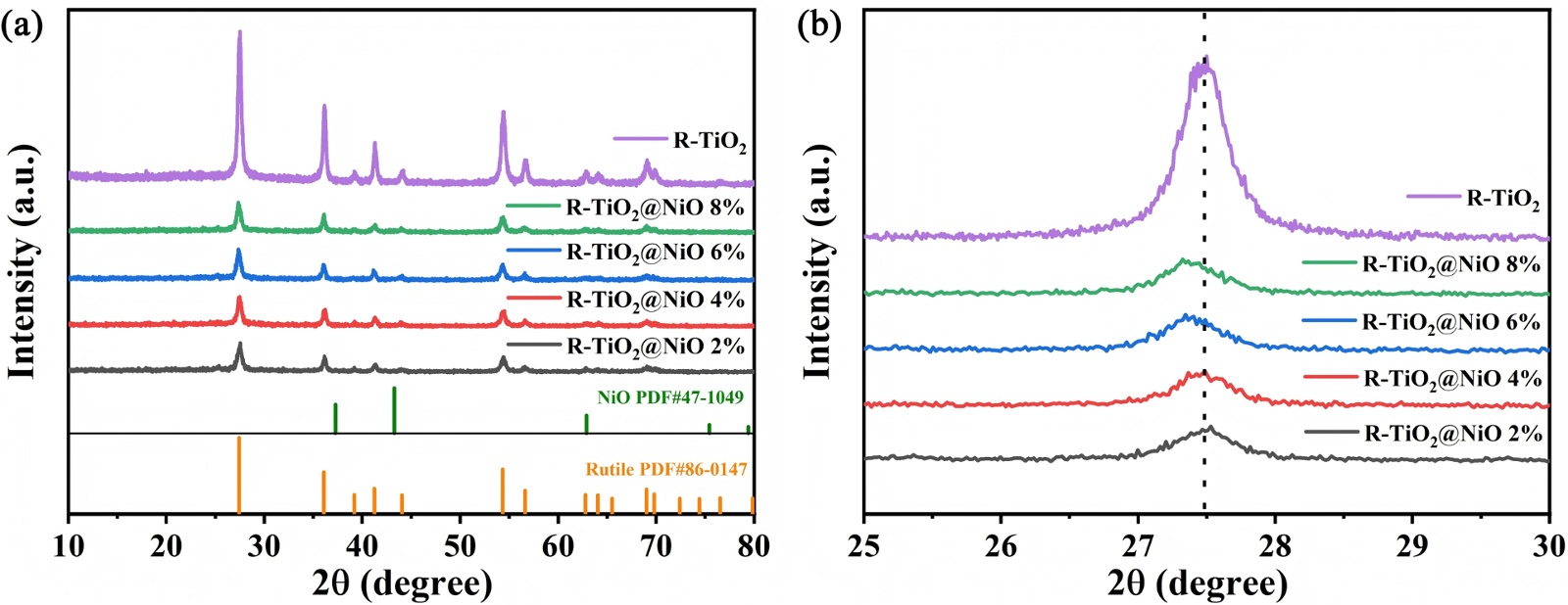 Figure 3. (a) XRD patterns and (b) magnified diffraction peaks of (110) crystal planes of samples with different concentrations of NiO modification