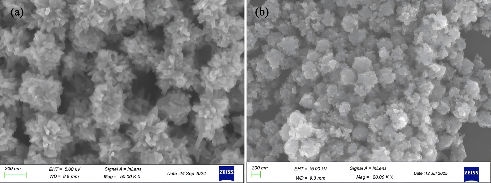 图4中,图4(a)中的颗粒呈近似球形,颗粒间存在轻微软团聚现象,这是纳米粉末的典型特征,团聚主要由颗粒间范德华力导致,图4(b)基本颗粒形貌未发生显著改变,仍保持近似球形结构,无明显粒径变化。