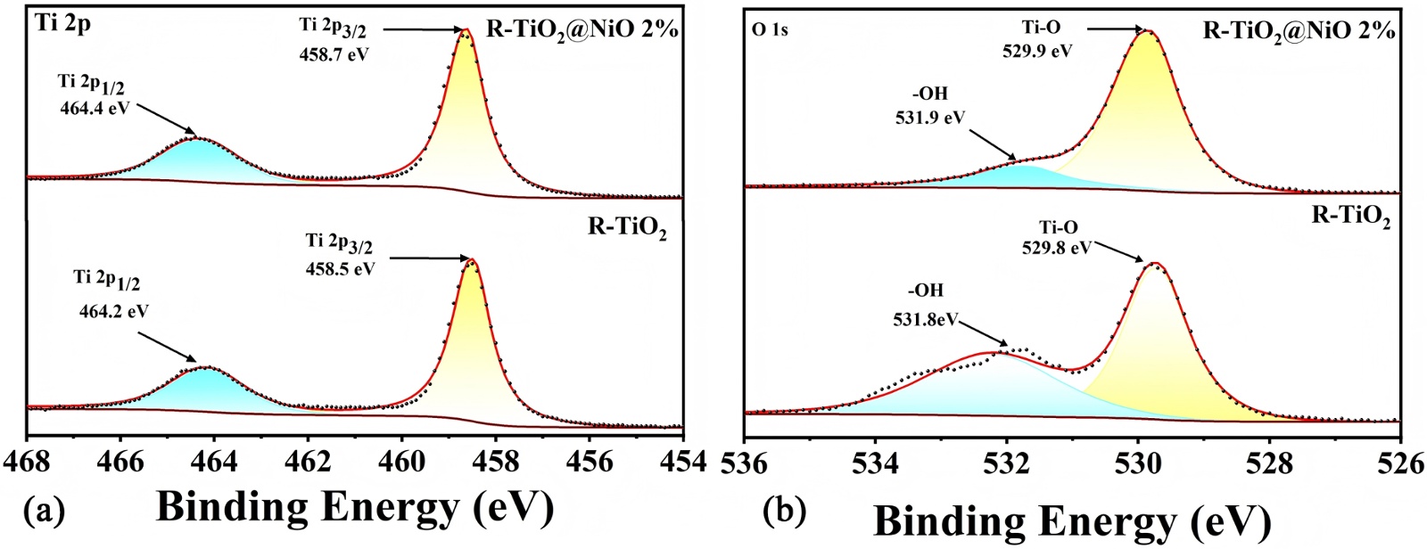 通过对比R-TiO2与R-TiO2@NiO 2%的Ti2p XPS光谱(图5(a)),可直观解析NiO修饰对Ti电子环境的调控作用。对于Ti2p轨道,R-TiO2@NiO 2%中Ti 2p3/2和Ti 2p1/2的结合能分别为458.7 eV和464.4 eV,较R-TiO2的458.5 eV和464.2 eV呈现整体正移趋势。结合能的正移表明,NiO与R-TiO2形成异质结后,Ti周围的电子密度降低,这是由于Ni的电子亲和能特性促使光生电子从R-TiO2向NiO定向转移,有效抑制了电子–空穴对的复合概率,为后续催化还原反应保留了更多活性电子。