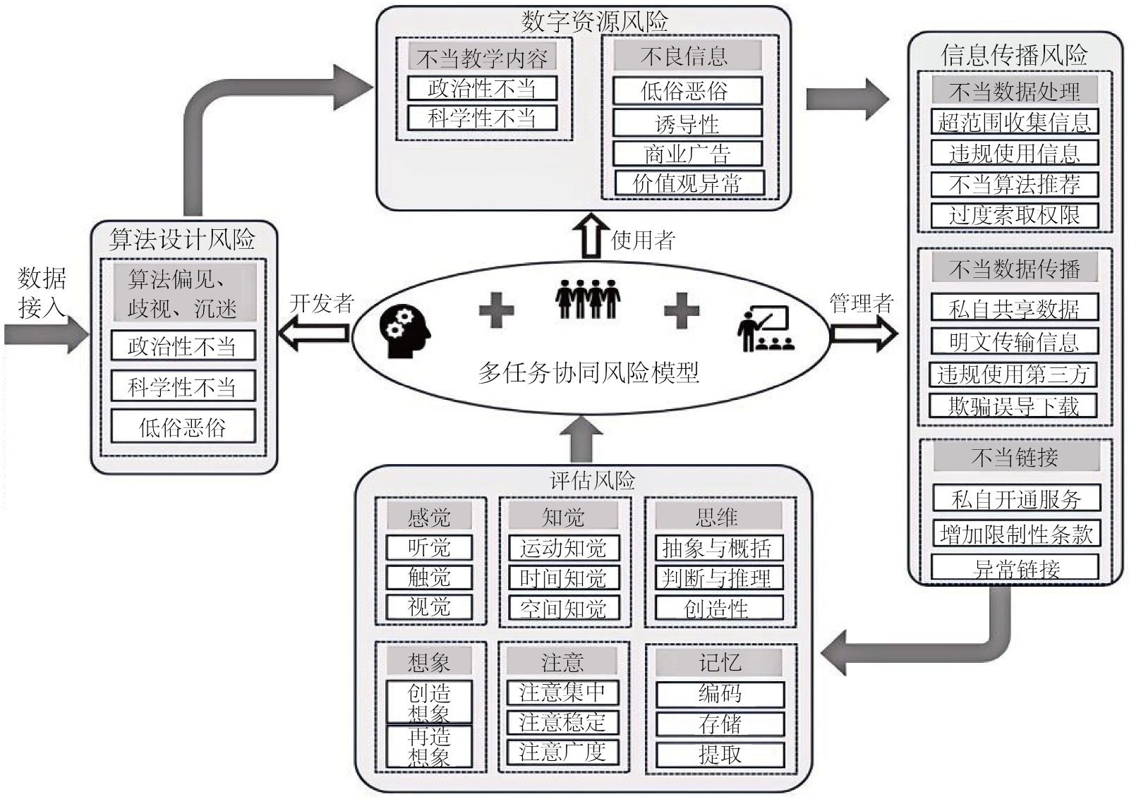 涵盖数据接入风险涵盖从AIGC模型库、商业平台端口、跨境语言文化教育到第三方接口等数字资源接入环节;其次,聚焦开发者层面,识别算法本身可能存在的结构性缺陷等;再次,模型体现信息传播风险关注管理者与使用者在信息流转中的责任边界,包括不当数据处理、过度索取系统权限、违规算法推荐,以及欺骗性引导下载等行为;最后,从使用者认知心理出发,构建了一个涵盖感知(视觉、听觉、触觉)、知觉(空间、时间、运动)、注意(集中性、稳定性、广度)、记忆(编码、存储、提取)、思维(抽象、推理、创造性)及想象(再造、创造)的多层次认知影响风险评估体系。