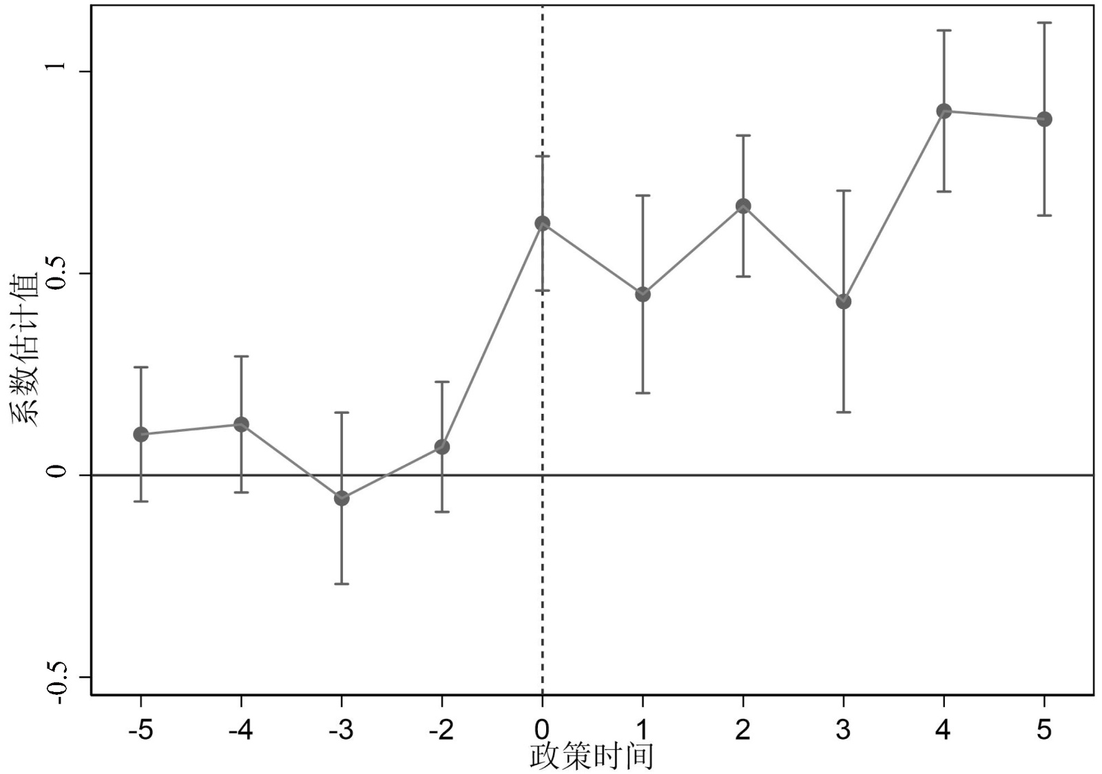 经过平行趋势检验,在没有实施“跨境电子商务综试区”政策的情况下,非试点城市与试点城市的家庭收入发展趋势相同。鉴于此,本文以政策实施前一期即−1作为基准组,采用事件研究法(event-study)检验实验组与对照组是否满足平行趋势假定。图1报告了95%置信区间下的平行趋势检验结果,横坐标为政策时点,纵坐标表示政策效应的估计系数。