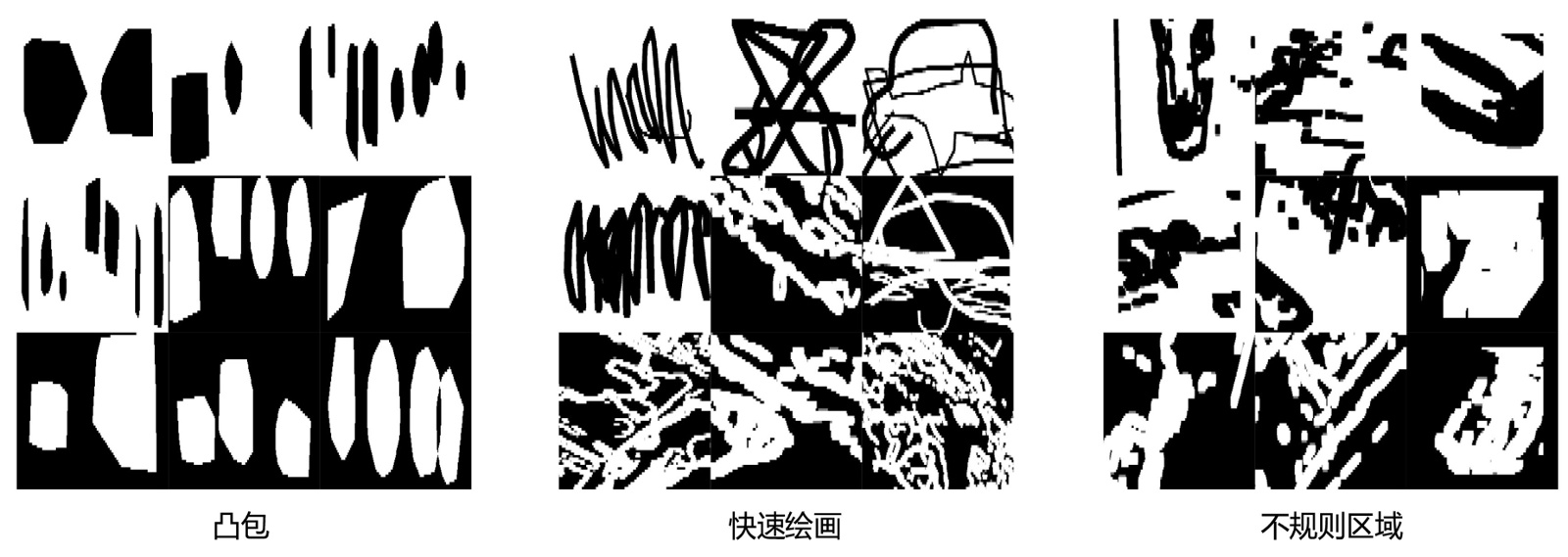 (1) 通过3种掩码生成方法,随机生成长宽在64至256之间的基础掩码图像。