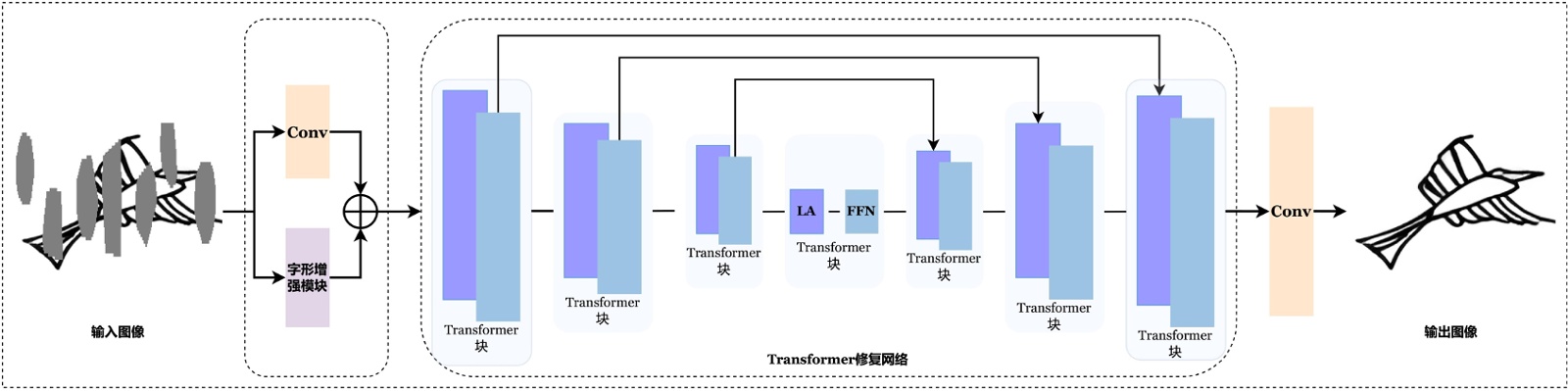 图3. 基于字形增强与Transformer的东巴字符图像修复网络总体结构图