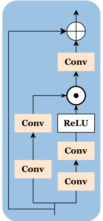 FFN模块如图6所示。在第k个Transformer块中,输入特征被分流至两条并行路径。扩展路径利用由2个1 × 1级联卷积构成的通道扩展模块,将特征通道维度从C扩展到rC,其中,r为扩展比;门控路径则通过两个级联的3 × 3深度卷积配合ReLU激活函数[20],生成门控权重。随后,利用逐元素点乘机制,将门控权重与高维扩展特征进行融合,实现对特征的空间自适应调制。最后,通过一个1 × 1卷积将通道数压缩回C,并引入残差连接与输入特征融合,完成特征的重构与更新。在第k个Transformer块中,FFN的计算过程如公式(8)所示: