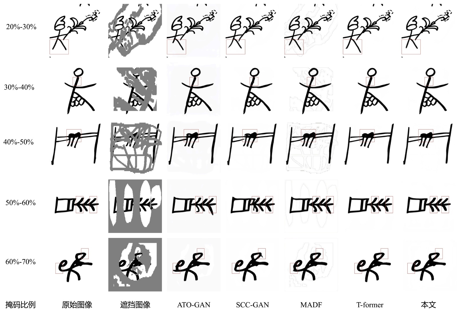 除了定量指标外,为了更直观比较5种算法的修复效果,本文还采用了定性比较方法。图7表示在东巴数据集上,针对不同损坏程度手写东巴文字的修复效果。