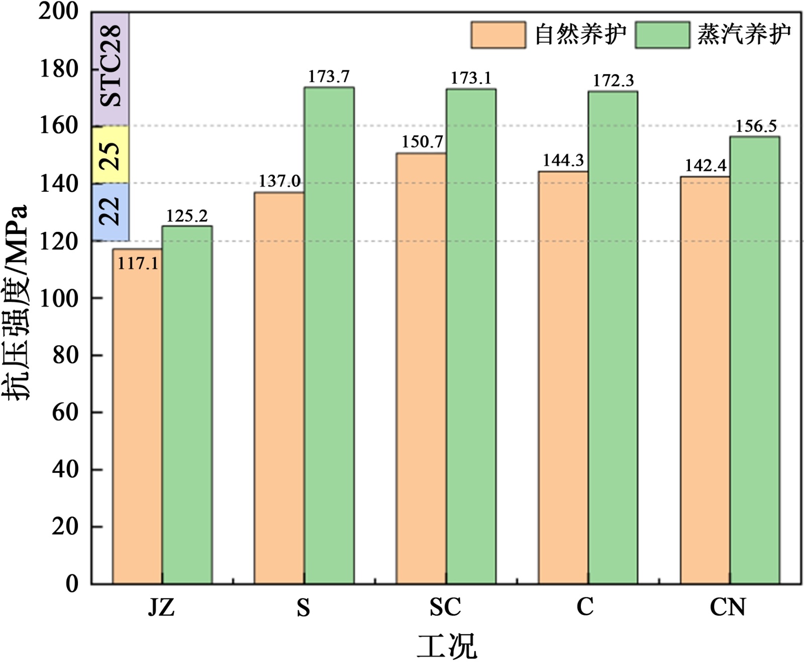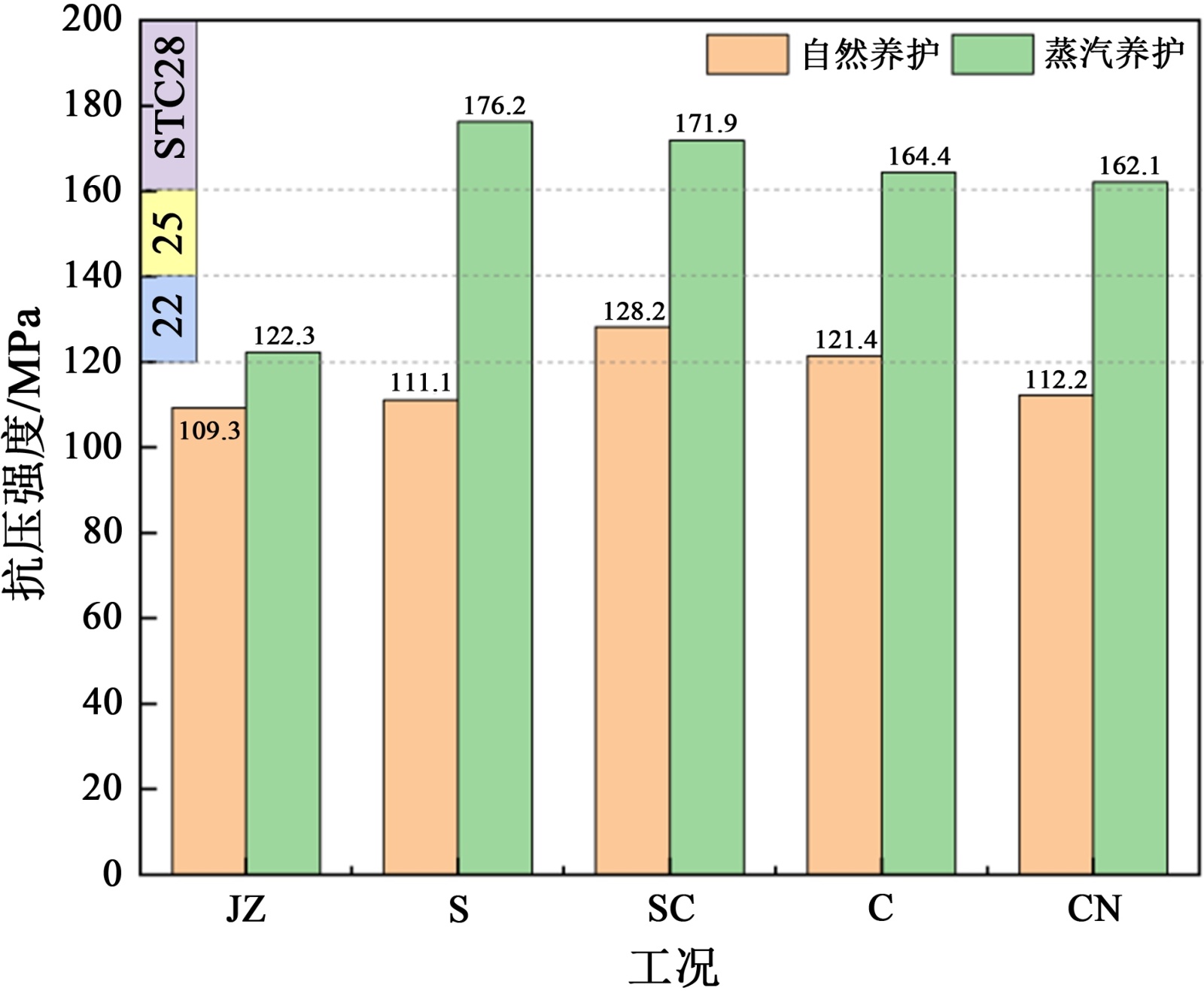 图8表明,蒸养养护条件下JZ组、S组、SC组、C组、CN组相对自然养护条件下7 d与28 d抗压强度均有所提高。可以发现,随着龄期的增长,自然养护下各工况抗压强度与蒸养养护下的差距逐渐减小,表明蒸汽养护条件下混凝土试件强度虽然更高,但后期强度发展优于蒸汽养护,JZ组和S组28 d抗压强度可达120 MPa以上,实现STC22的要求,SC组、C组、CN组28 d抗压强度可达140 MPa以上,实现STC25的要求,自然养护简化了工艺流程,降低了养护成本,仍能满足部分工程对混凝土强度要求,促进了STC的推广和应用。