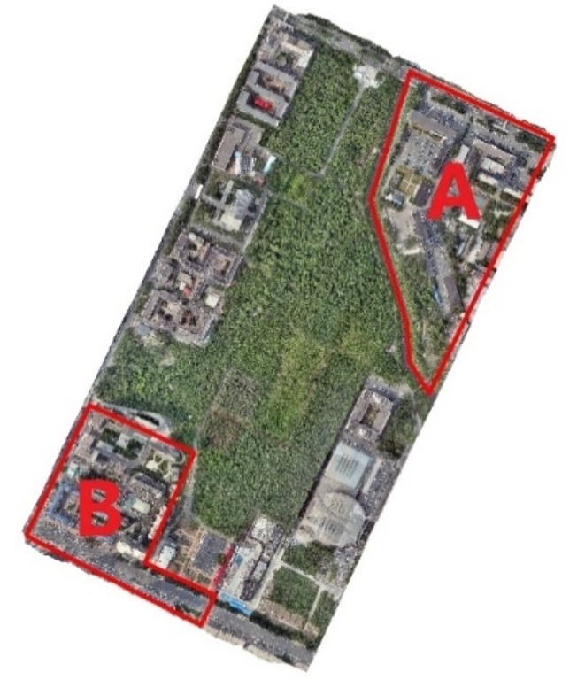 本文所选的研究区域为东北林业大学校区,位于黑龙江省哈尔滨市香坊区,如下图1所示。该区域地物特征多样,并且数据采集较为方便,易于获取。其中部分道路和操场与植被颜色相似,这使得后续的分类实验难度提高,且植被类型丰富,林地与草地覆盖较多,为验证植被精细分割算法提供了理想的复杂场景。