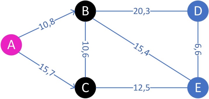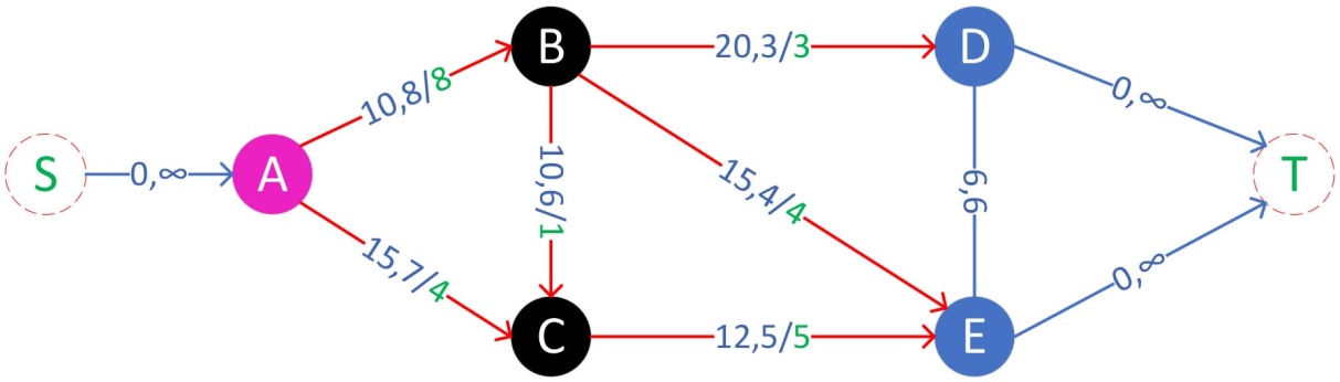 图1中每条边上的第一个数字表示网络流通过边的花费,第二个数字表示边的最大容量。粉色节点A表示供应点,黑色节点B,C表示中间节点需求量为0,蓝色节点D,E表示需求点。假设需要将A的总供应量15全部运往D,E,表示此示例中
