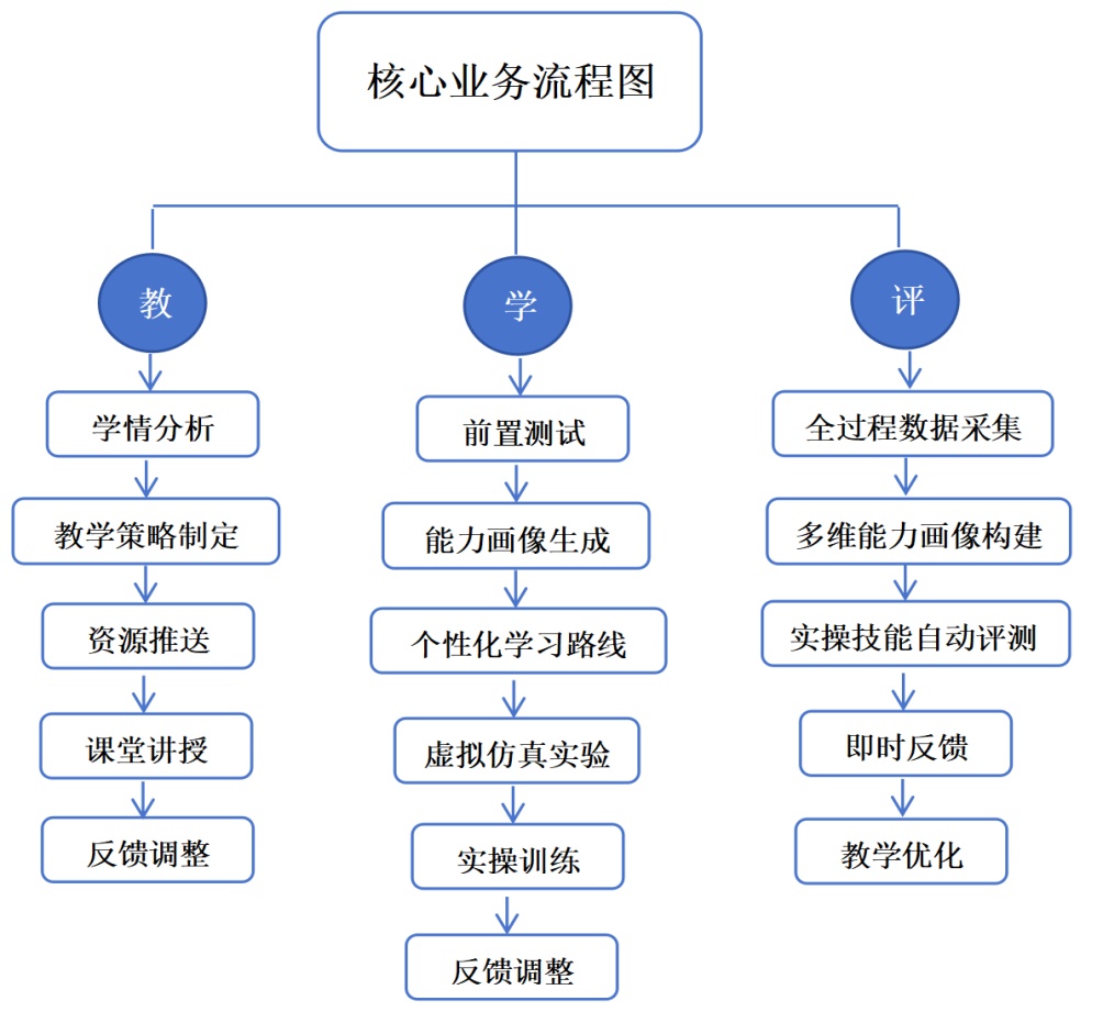 AI具体赋能路径贯穿“教、学、评”三个关键环节,核心业务流程图如图2所示。