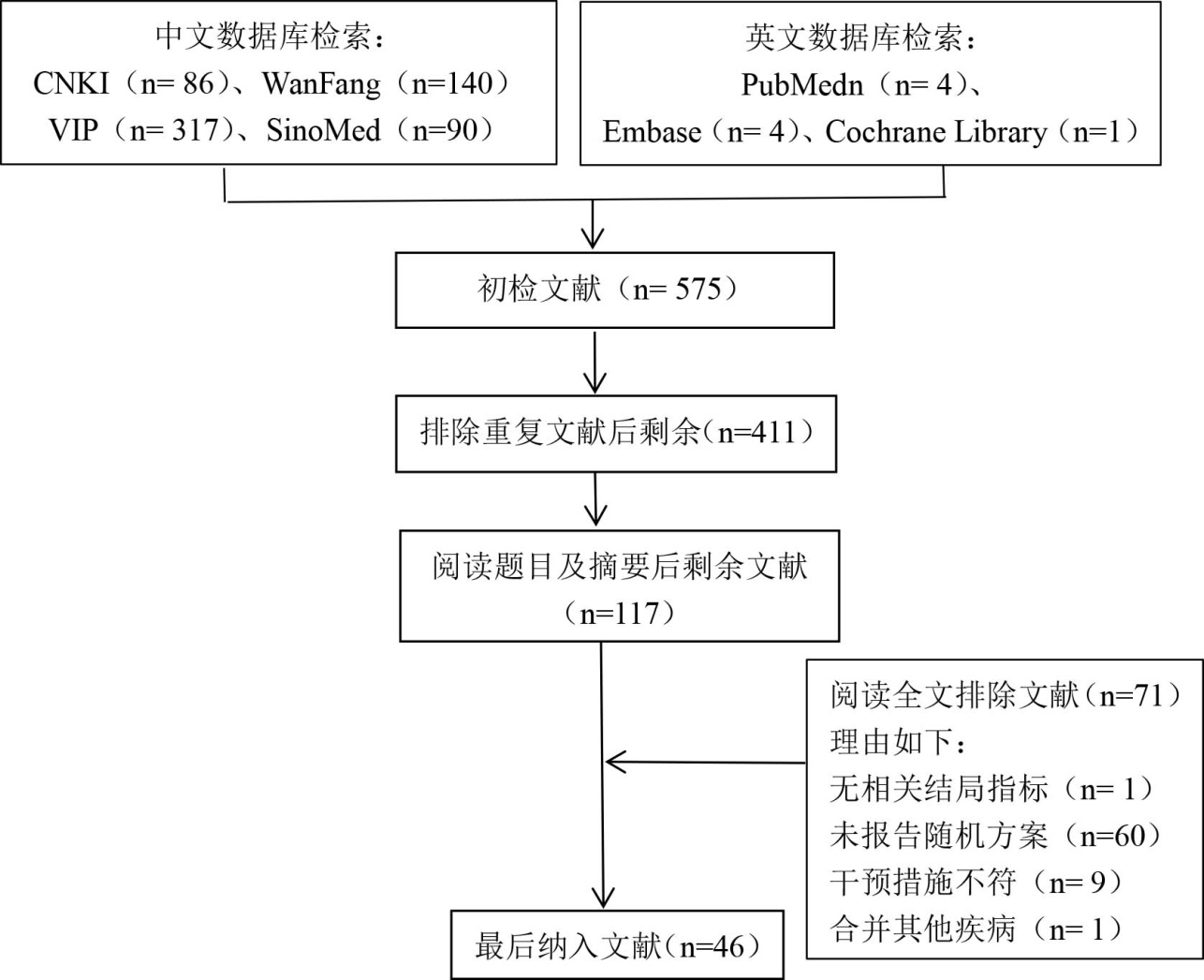 初步检索共获得文献575篇,经NoteExpress去重后排除164篇,剩余411篇。通过阅读题目及摘要,排除294篇不符合纳入标准的研究,剩余117篇研究。进一步阅读全文后,剔除71篇,最终纳入46篇文献[9]-[54],全部为中文文献。文献筛选流程见图1,纳入文献基本特征详见表1。