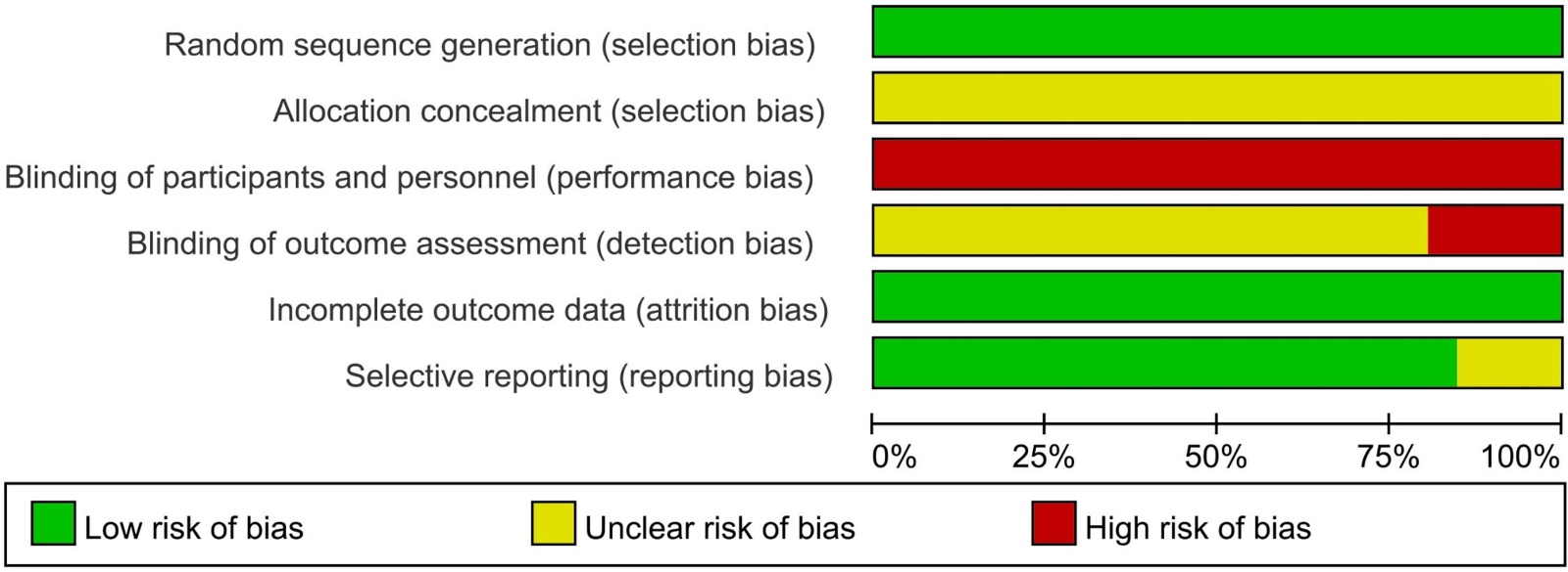 方法学质量评价采用Cochrane偏倚风险评估工具,包括随机序列的生成、随机分配隐藏、研究对象的盲法和结局评价者的盲法、不完整结局报告、选择性结局报告六个条目,对每个研究做出低偏倚(low)、高偏倚(high)、不清楚(unclear)的判断[8]。由两名研究者分别完成,针对分歧条目进行交叉验证;若不一致,双方讨论达成一致意见或由第三方进行判断。