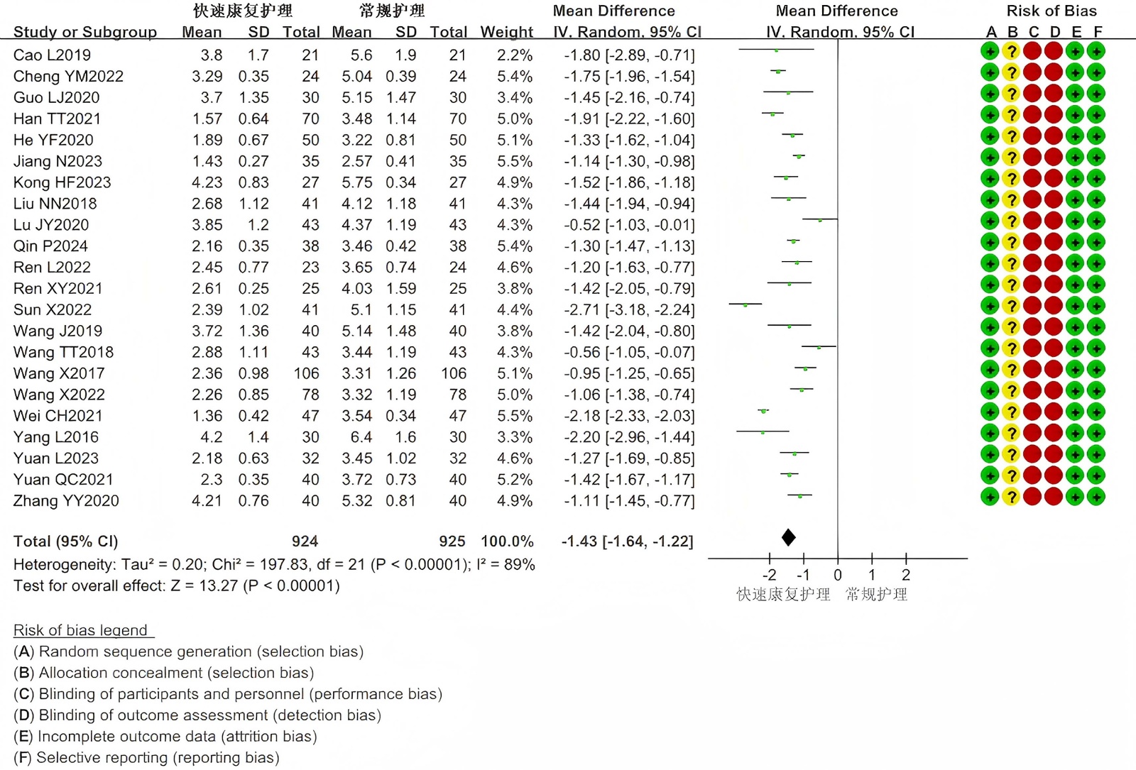 22篇研究[10] [14] [17] [19]-[23] [27] [29]-[35] [37] [40] [42] [44] [45] [54] (共1849例受试者,试验组924例、对照组925例)的Meta分析结果显示,快速康复外科护理可降低甲状腺癌患者VAS评分(MD = −1.43分,95% CI [−1.64, −1.22],I2 = 89%),见图4。