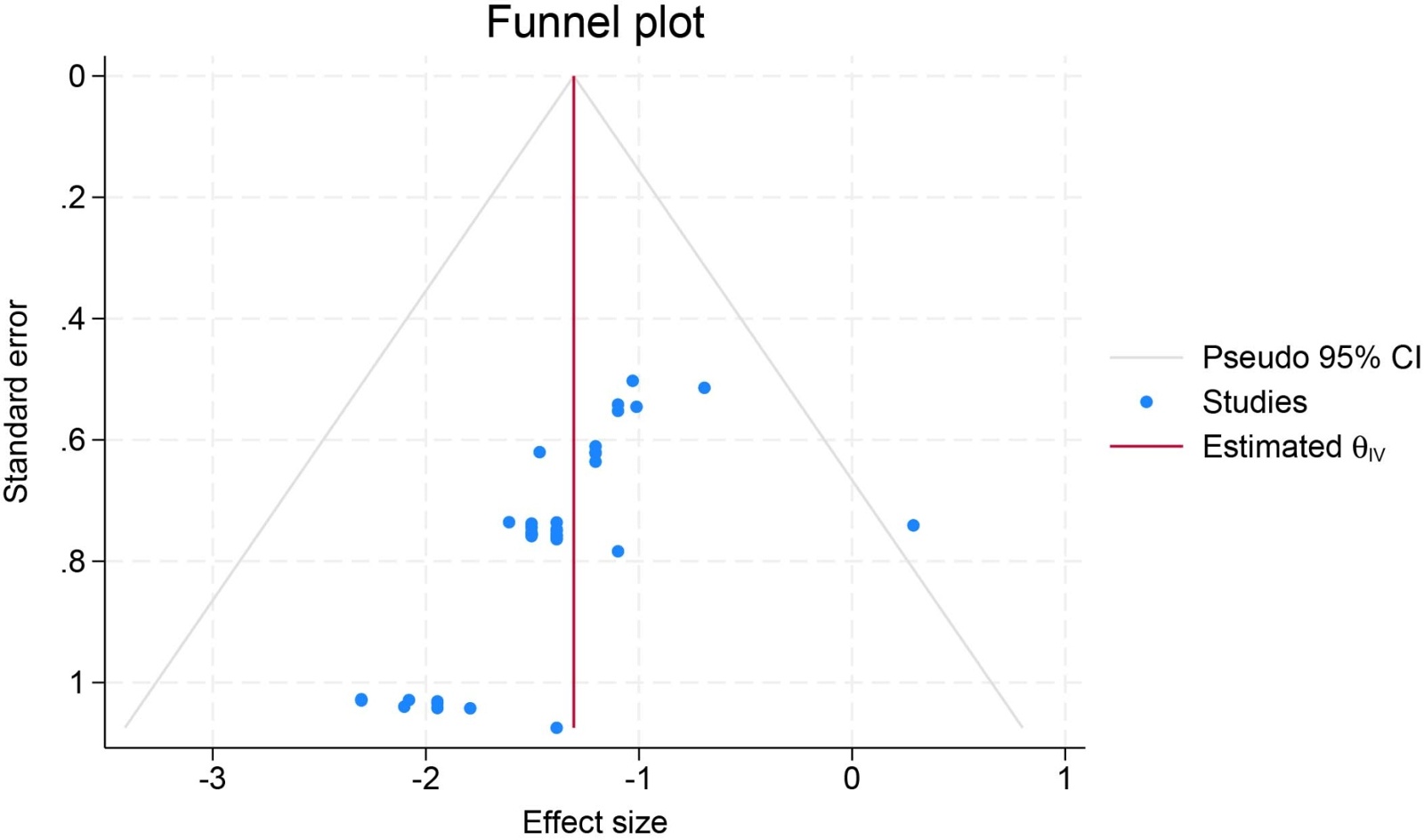 采用RevMan 5.4开展Meta分析:二分类变量用相对危险度(RR),连续型变量用均数差(MD)/标准化均数差(SMD)及95%可信区间(95% CI);通过χ2检验和I2判断异质性,I² ≤ 50%用固定效应模型,>50%用随机效应模型,异质性高时行亚组或敏感性分析,I2 > 90%则描述单项研究结果;系统评价后描述合并结果或定性单个结果,若结局指标纳入文献 ≥ 10篇,用Stata 18.0绘制漏斗图并做Egger检验评估发表偏倚。