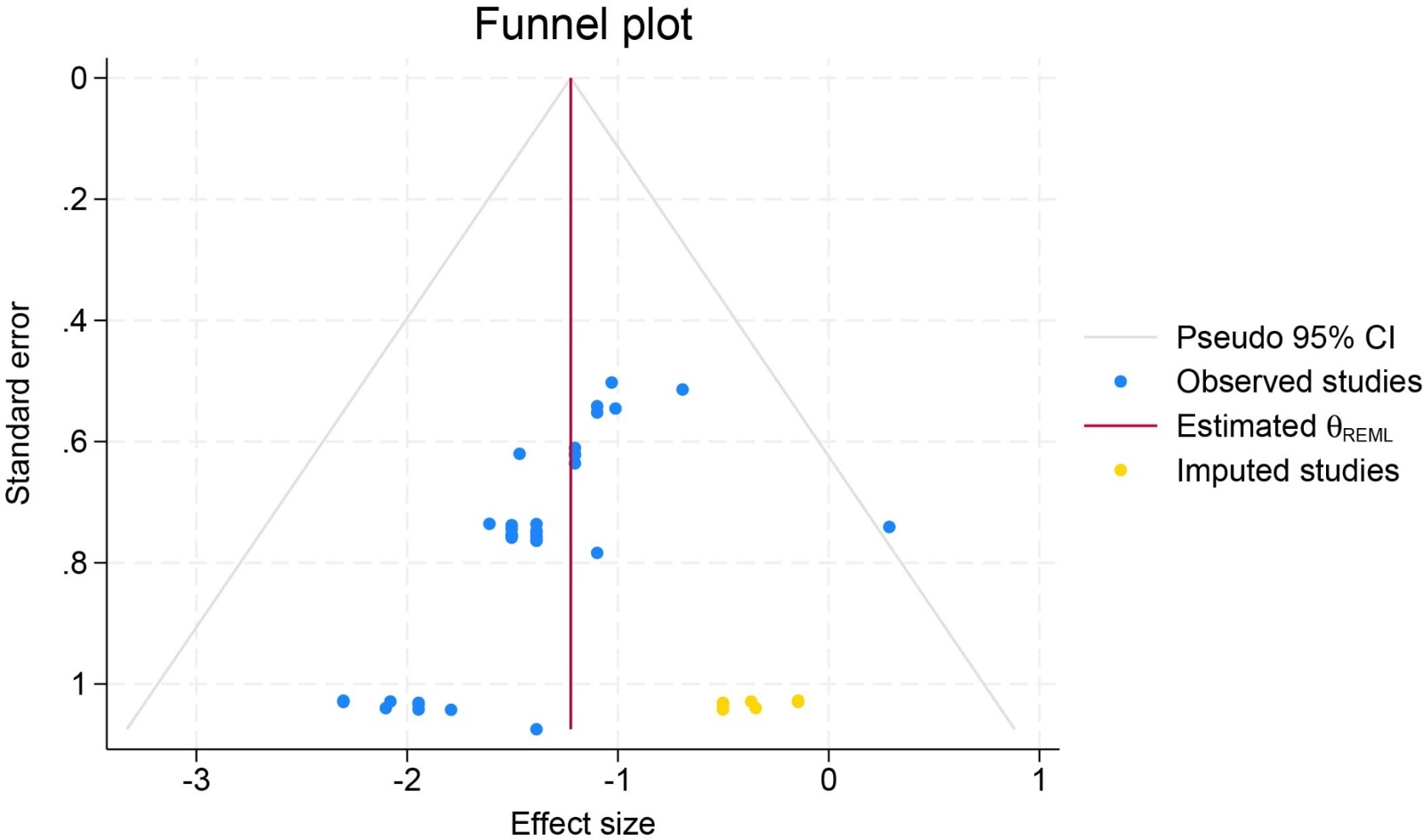 通过Stata绘制漏斗图考察并发症发生率是否存在发表偏倚,漏斗图不对称提示可能存在发表偏倚,见图6(A)。同时进行Egger检验P = 0.0192 < 0.05,说明存在发表偏倚。剪补法后绘制的漏斗图见图6(B),使用剪补法处理后得到RR = 0.29, 95% CI [0.23, 0.37],与剪补法处理前数据方向一致,说明发表偏倚未对Meta分析的结论造成显著影响。