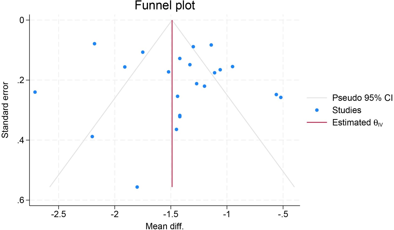 通过Stata绘制漏斗图考察VAS评分是否存在发表偏倚(见图7),同时进行Egger检验P = 0.7796 > 0.05,说明不存在发表偏倚。