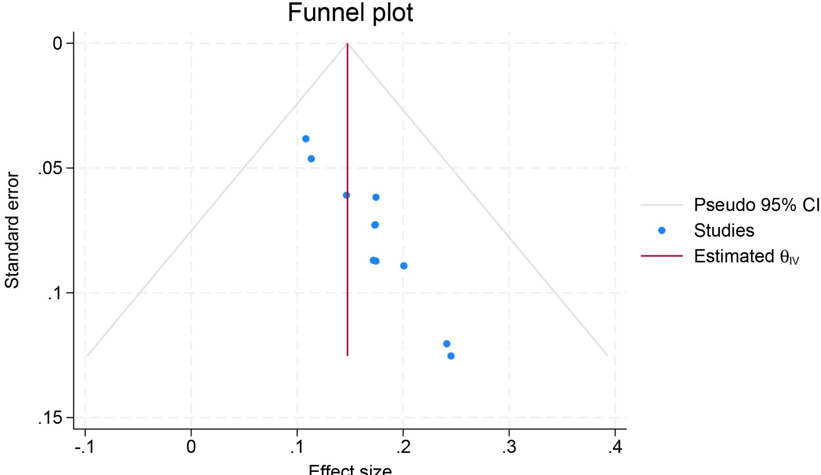 通过Stata绘制漏斗图考察护理满意度是否存在发表偏倚(见图8),同时进行Egger检验P = 0.0631 > 0.05,说明不存在发表偏倚。
