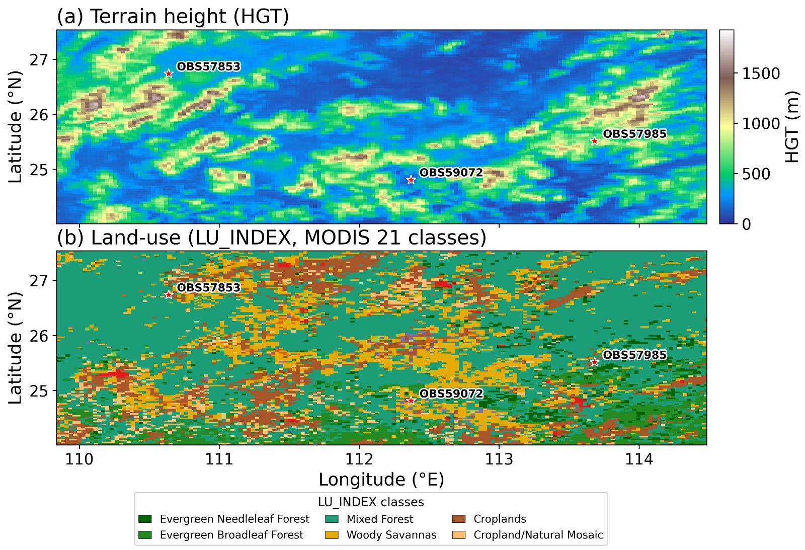 Figure 1. Study area topography, land cover, and station locations. (a) Terrain height (HGT; m); (b) Land-use categories (LU_INDEX; MODIS 21 classes). Star markers denote the automatic weather stations used for evaluation: OBS57853, OBS59072, and OBS57985. The legend retains only classes whose areal share within the current map extent is ≥ 1% (evergreen needleleaf forest, evergreen broadleaf forest, mixed forest, savannas, croplands, and cropland/natural vegetation mosaic)