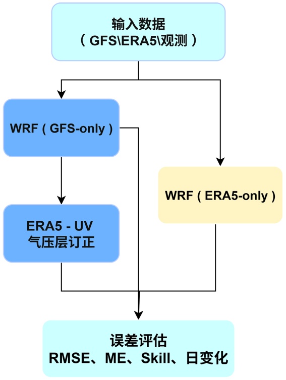 如图2所示,本研究设计了三个平行的数值试验,旨在评估ERA5风场订正对GFS驱动模拟的改进效果(图2)。