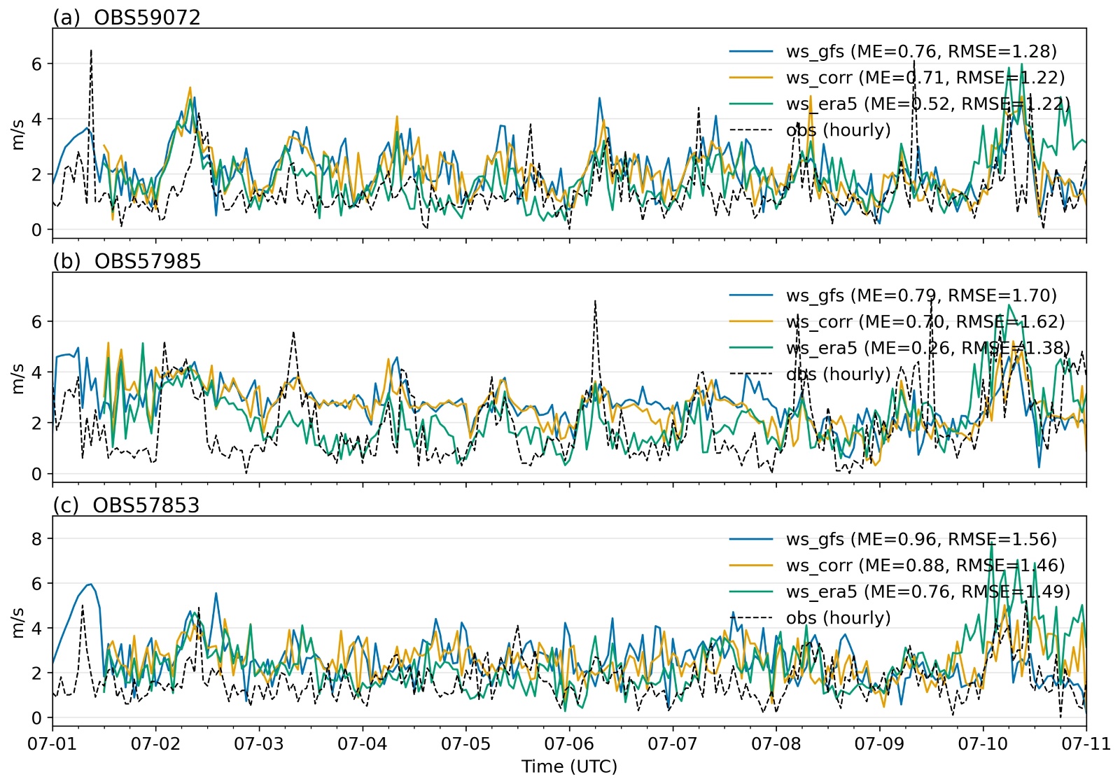 Figure 3. Hourly 10-m wind-speed time-series for three schemes: (a) OBS59072, (b) OBS57985, (c) OBS57853. The black dashed line shows hourly observations; blue: WRF driven by GFS (ws_gfs); orange: WRF with ERA5 wind-vector correction applied to the shared GFS pressure levels (ws_corr); green: WRF driven by ERA5 (ws_era5). All curves denote 10-m wind speed (m∙s−1). The legend reports ME and RMSE (m∙s−1) computed over the evaluation period after pairing to the nearest whole hour (±31 min). Model values at each station are formed from U10/V10 (vector combination). The three forecasts are concatenated into continuous series using daily anchors, selecting for each hour the forecast with the minimum lead time