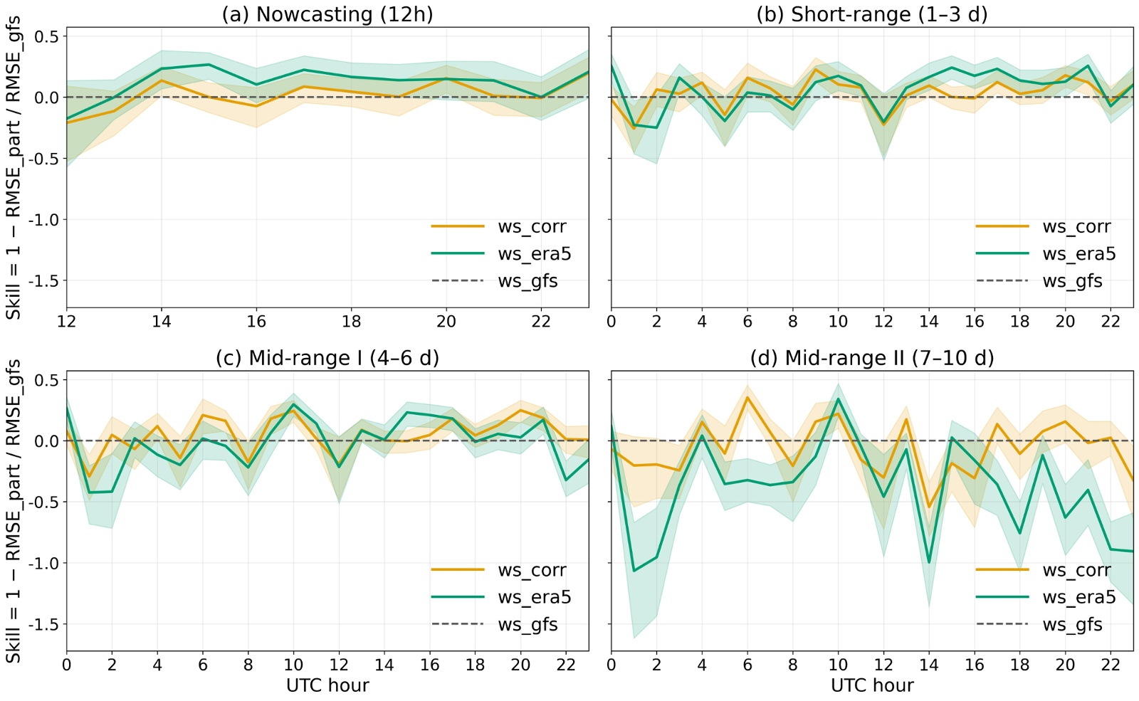 Figure 4. Hourly skill, aggregated over the three stations, shown as a four-panel plot. Skill is defined as 1 − RMSE_part/RMSE_gfs; positive values indicate improvement over the GFS-only baseline. Panels: (a) Nowcasting (12 h; only forecast leads initialized for 12~23 UTC are counted), (b) Short-range (1~3 d), (c) Mid-range I (4~6 d), and (d) Mid-range II (7~10 d). Curves: ERA5 wind-vector pressure-level correction (ws_corr, orange) and ERA5-only control (ws_era5, green). The gray dashed line marks zero improvement relative to the GFS baseline