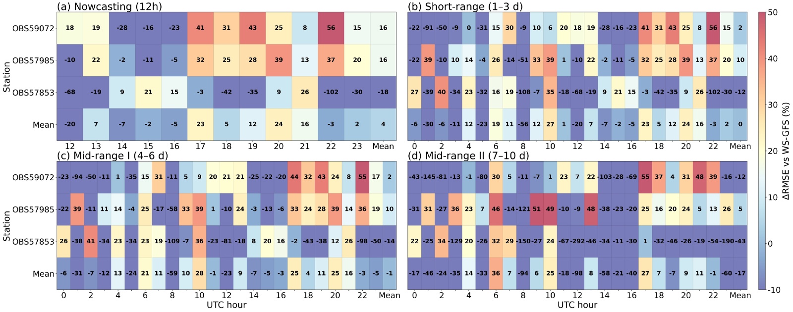 图5. 逐UTC小时的ΔRMSE (%)热力图。ERA5-UV气压层订正(ws_corr)相对WS-GFS基线(ws_gfs)。四个子图按预报时期分组:(a) Nowcasting (12~23 UTC)、(b) Short-range (1~3 d)、(c) Mid-range I (4~6 d)、(d) Mid-range II (7~10 d)。每个面板按行给出三个站点(OBS59072、OBS57985、OBS57853),按列给出UTC小时;格内数字为ΔRMSE (%),色标范围−10%至50%。ΔRMSE定义为100 × (1 − RMSEws_corr/RMSEws_gfs):正值表示相对WS-GFS的RMSE降低(改进),负值表示RMSE升高(退化)。每个面板底部的“Mean”行是对三站的行均值,最右侧“Mean”列是对该时期所有UTC小时的列均值