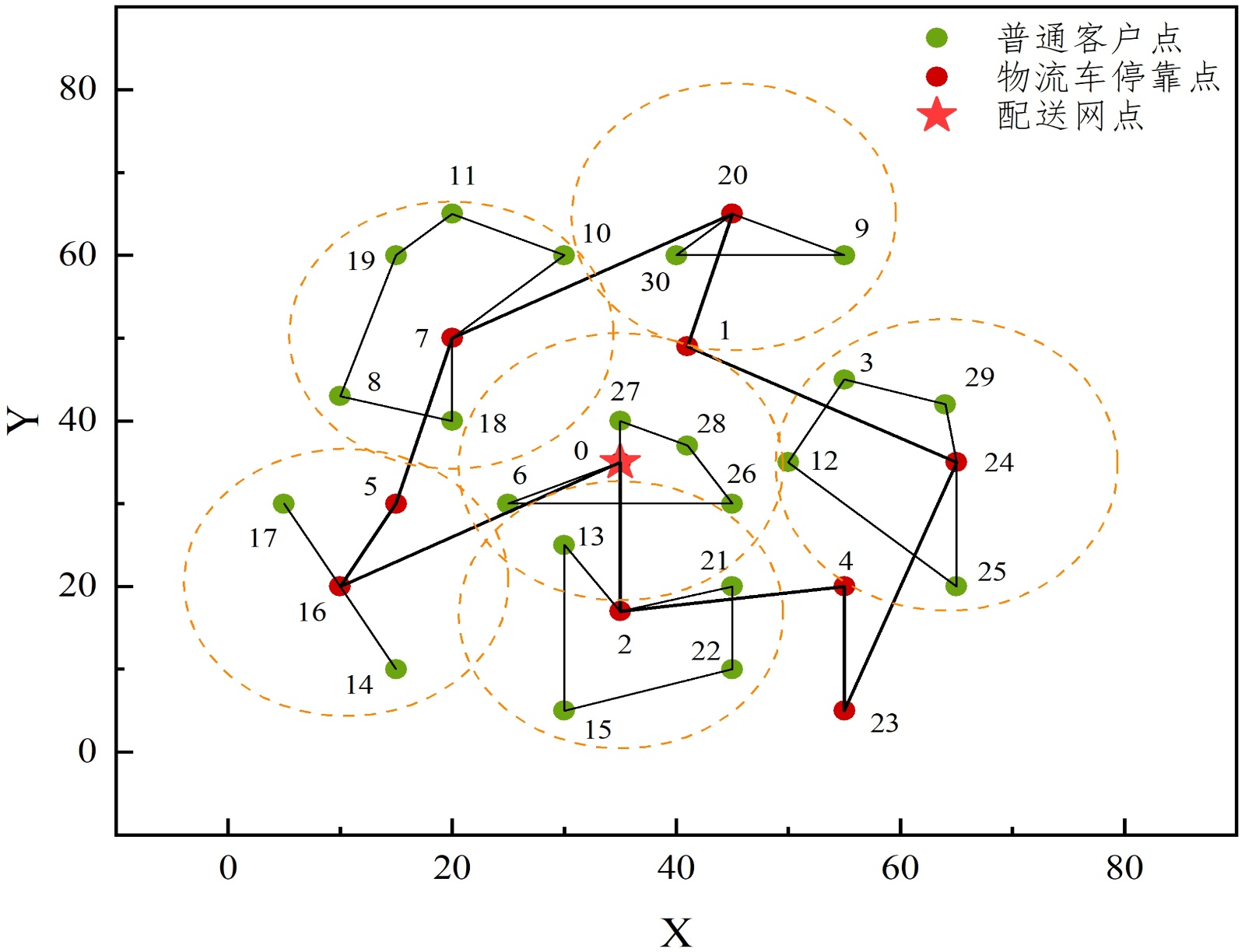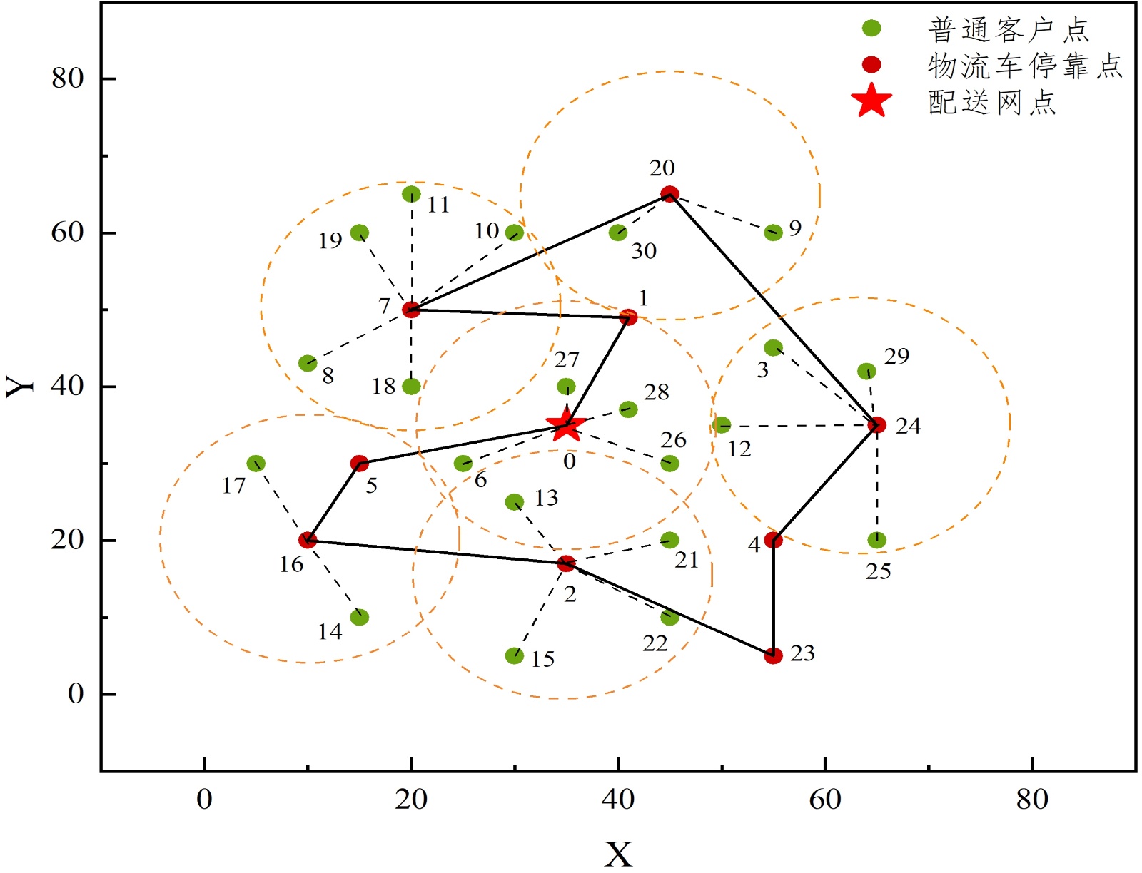 在城市配送网络中,中转站需按时间窗要求向辐射范围内的客户点派送货物。为提高效率,采用载有多台无人机的物流车依次前往各服务区域执行任务。物流车停靠点既是车辆服务点,也是无人机作业中心,其作业半径内的节点组成服务集群。车辆到达停靠点后需要完成该点的配送,并调度无人机服务周边客户。车辆需原地等候无人机返航进行物资补给,再驶往下一站点。系统存在时间窗约束,超时交付产生惩罚成本。部分客户点的订单因超重或需人工签收,必须由物流车配送,称为“特定客户点”;其余可由物流车或无人机灵活调度的常规订单则归类为“普通客户点”。本研究为便于建模,按照包裹重量作为客户分类的依据。