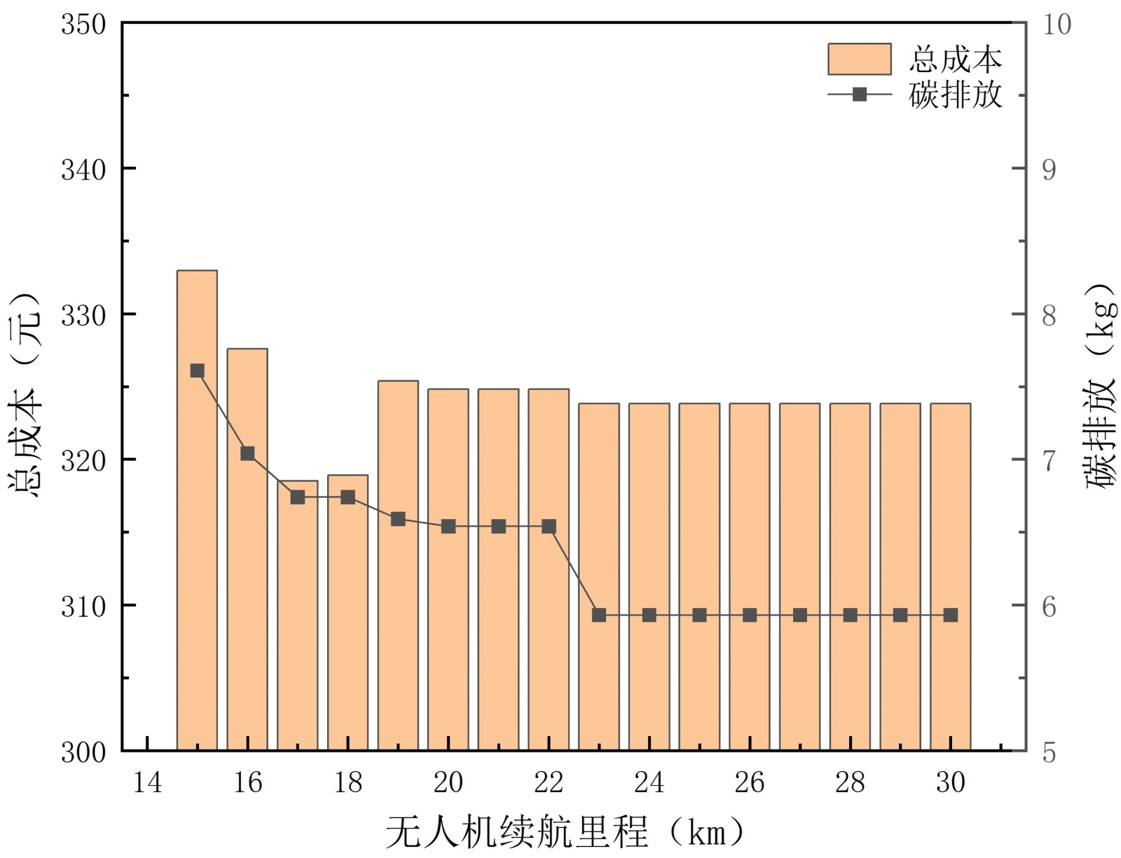 图4. 总成本及碳排放随无人机续航里程变化趋势