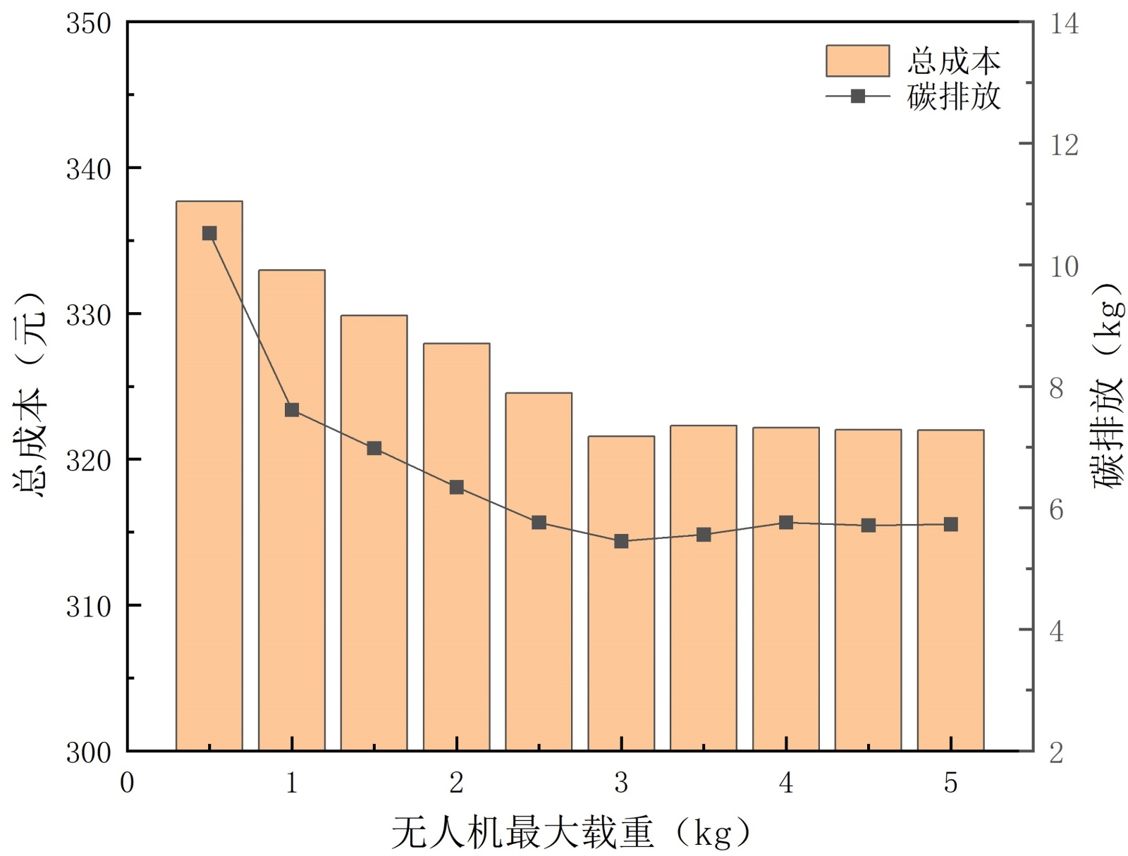 图5. 总成本及碳排放随无人机最大载重变化趋势