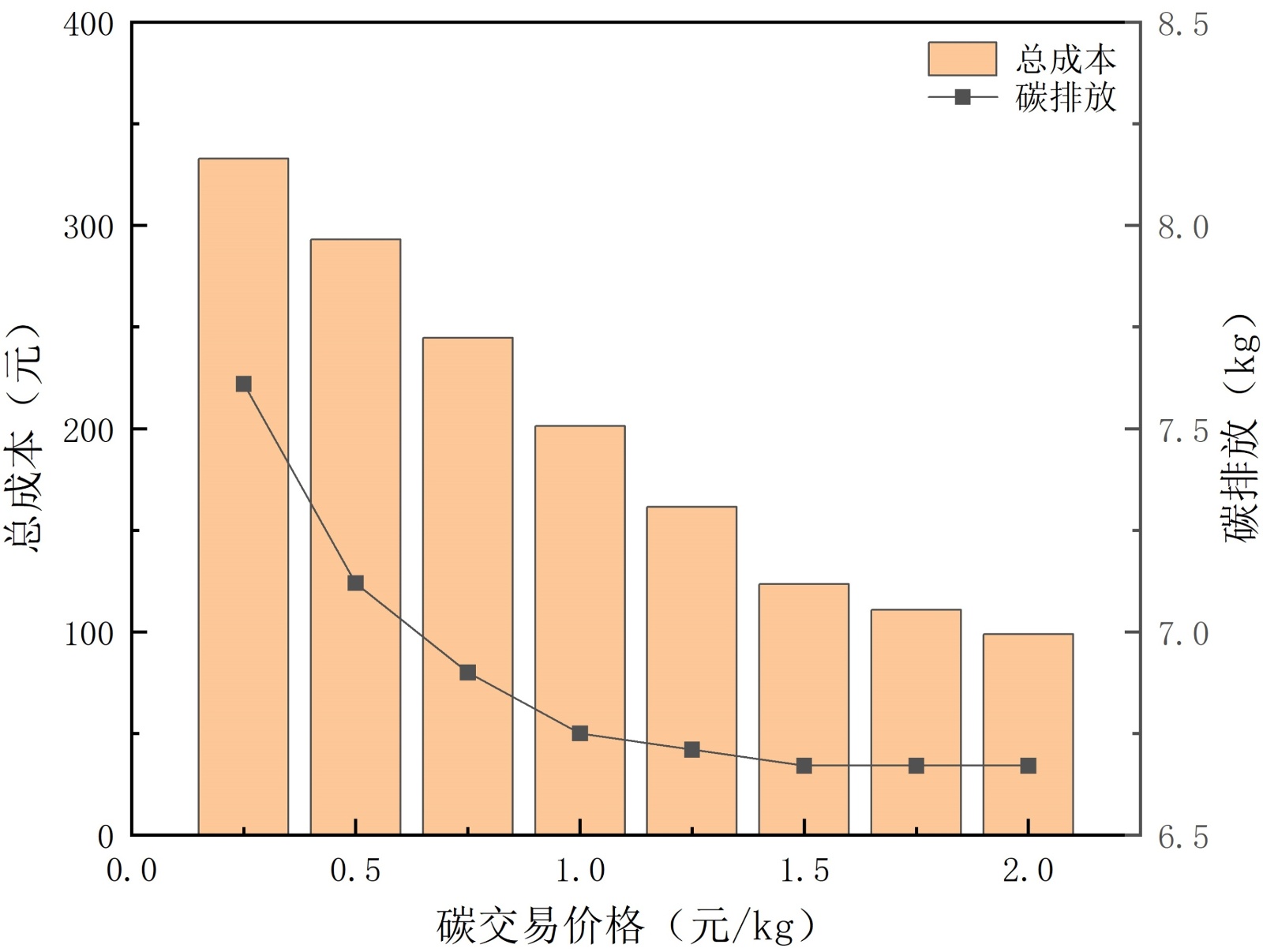 图6. 总成本及碳排放随碳交易价格变化趋势