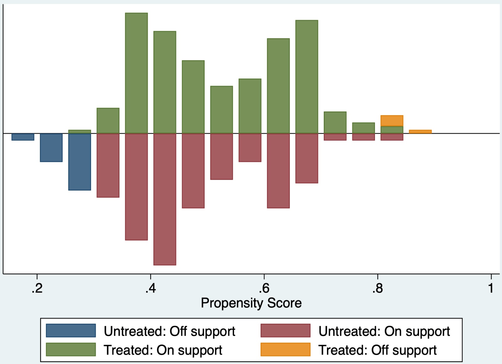 由于用户对数字艺术疗愈服务的采纳行为并非随机分配,而是存在显著的自选择偏差,直接采用OLS回归会导致估计结果偏误。因此,本研究采用倾向得分匹配法(PSM)构建反事实框架,以更准确地估计服务采纳的净效应。首先,将“持续使用数字艺术疗愈服务超过1个月”的用户界定为处理组,其余为对照组;接着采用Logit模型,以服务采纳状态为因变量,纳入技术采纳模型与体验营销理论的核心构念(感知易用性、感知有用性、情感价值感知、社交体验预期),以人口统计学特征、社会经济特征、数字消费特征、健康与家庭特征为控制变量,估计每个样本的倾向得分;采用最近邻匹配(k = 1)、半径匹配(半径 = 0.05)和核匹配三种方法,为处理组样本匹配特征最相似的对照组样本,确保两组样本在可观测特征上具有可比性;最后计算匹配后处理组与对照组的在线消费满意度均值差异,即为数字艺术疗愈服务采纳的平均处理效应。