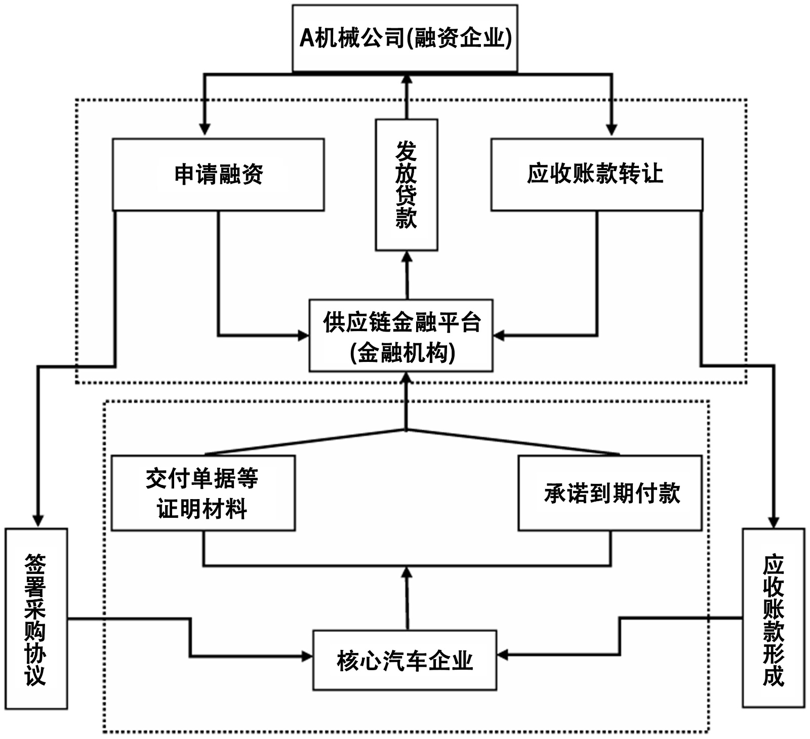 在传统融资渠道受阻、资金缺口持续扩大的困境下,A机械公司迫切需要寻找新的融资突破口。面对银行贷款审批慢、利率高的难题,以及供应商断供、核心企业订单违约的双重危机。经过多方调研与评估,企业接入核心汽车企业供应链电商融资平台,与平台合作的供应商金融机构开展订单融资与应收账款质押的组合融资模式,形成了三方协同,如图2。