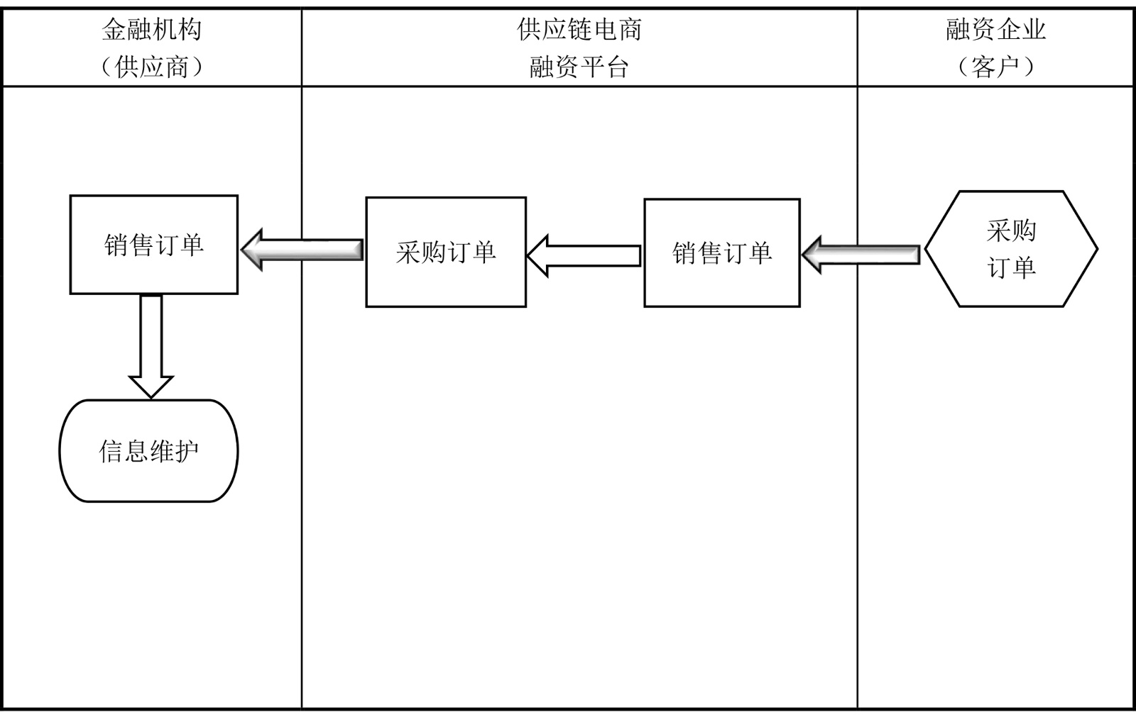 金融机构接收平台发来的采购订单后,重新生成另一个对应的销售订单,完成订单在金融机构侧的承接,金融机构开展信息维护工作,涵盖订单相关信息的录入、核对、存档等,确保业务数据准确、可追溯。经平台流转到金融机构响应并完成信息基础工作,形成完整的供应链电商融资订单流程闭环,保障后续金融服务、货物交付等环节基于清晰订单与信息体系开展,具体逻辑如图5。