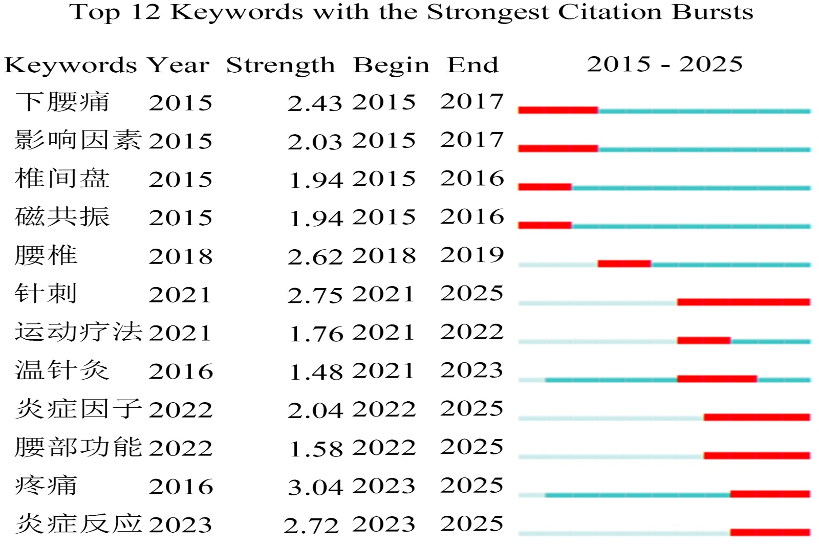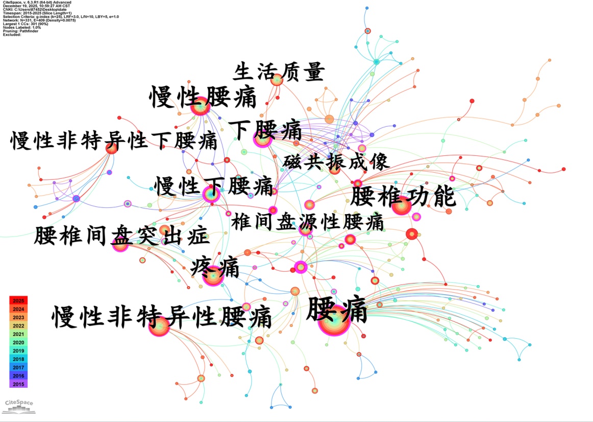 关键词突现分析显示,2015~2016年间,“腰椎间盘突出”是主要研究焦点;而2023~2025年间,“炎症反应”成为新的研究热点,提示腰痛病因研究正从结构性病变向炎症机制转变。