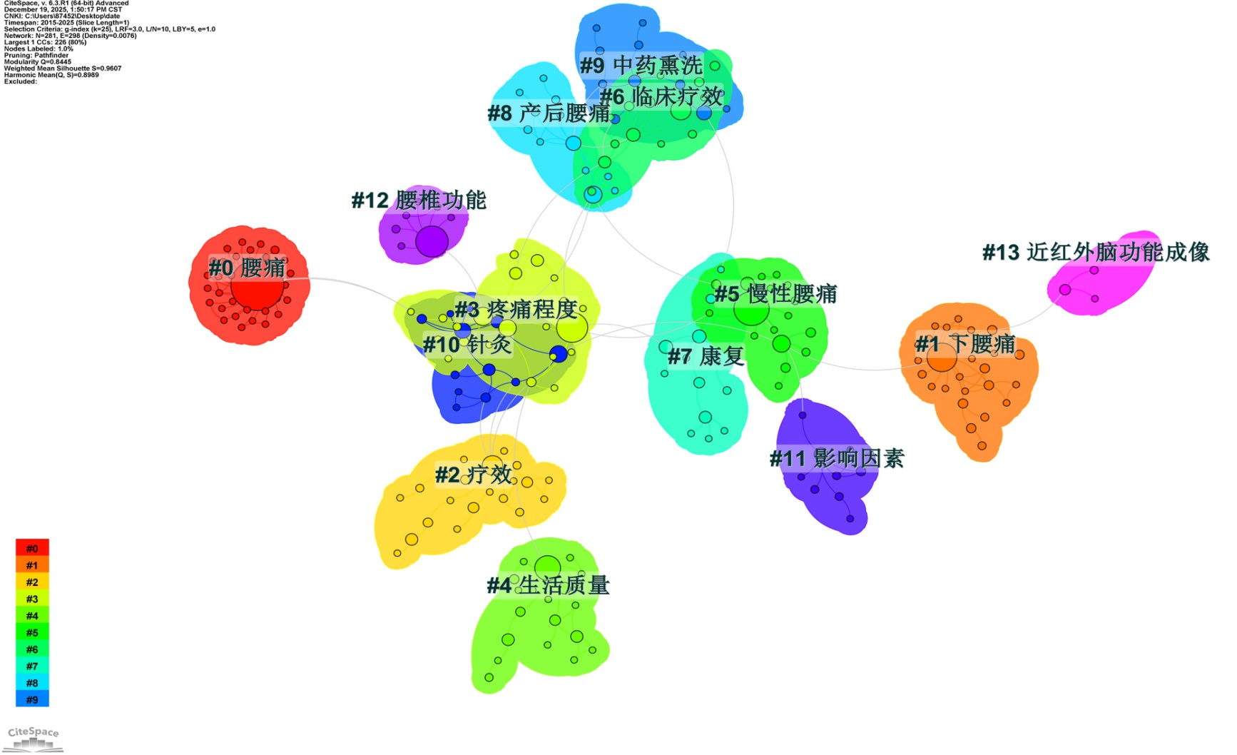 图3. 中国知网数据中腰痛患者关键词聚类知识图谱(2015~2025年)