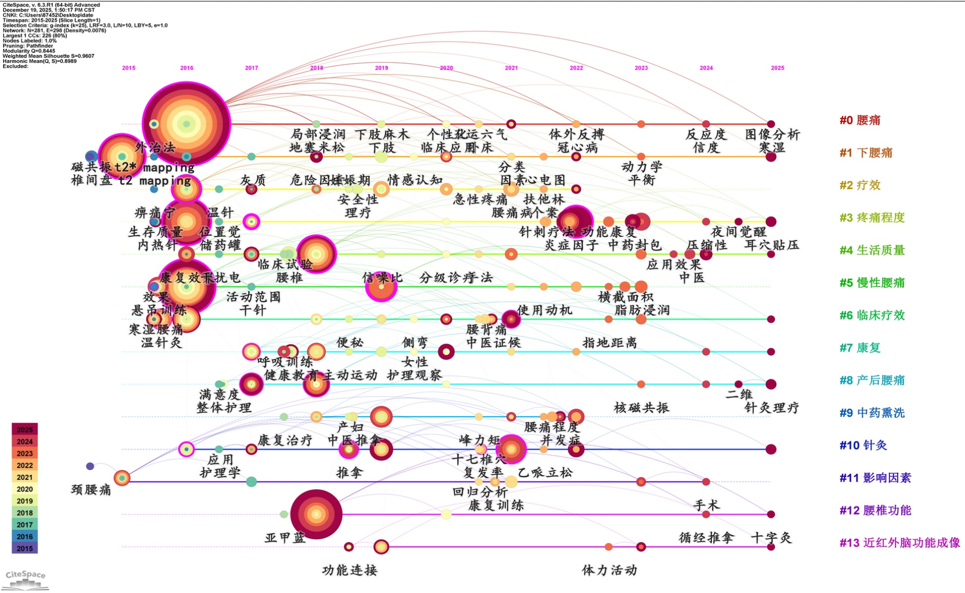 图4. 中国知网数据中腰痛患者关键词时间线图知识图谱(2015~2025年)