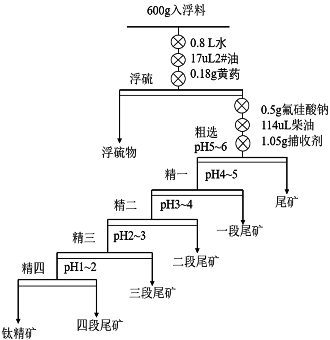 精选二段至四段:逐段降低pH值(精选二段:3~4;精选三段:2~3;精选四段:1~2),每段浮选时间逐步缩短(精选二段:5分钟;精选三段:3~5分钟;精选四段:3分钟),最终获得钛精矿。