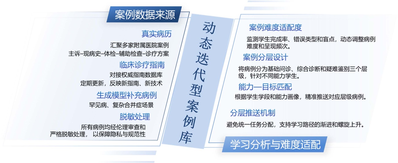 在案例来源与结构方面,案例库整合多源数据。一是汇聚多家附属医院脱敏后的真实病历,覆盖常见疾病谱,并按“主诉–现病史–体格检查–辅助检查–诊疗方案”的完整临床路径进行标准化标注,以保证情境的真实性和可推理性。二是对接权威临床诊疗指南数据库,利用关键词检索和内容解析定期更新反映新指南、新技术的病例,维持病例内容与循证证据的同步。三是借助生成模型补充罕见病与复杂合并症病例,拓展学生接触少见情境的机会。所有病例均经伦理审查和严格脱敏处理,以保障隐私与规范性。